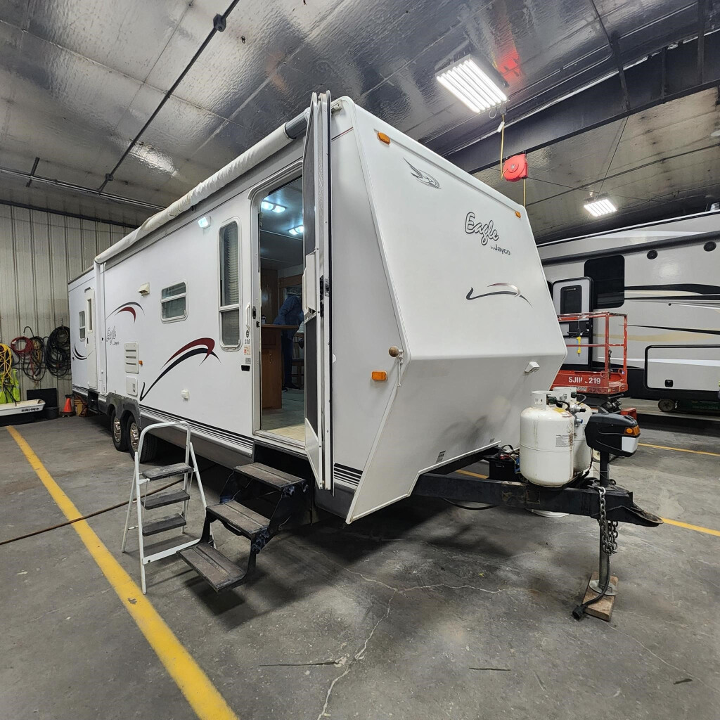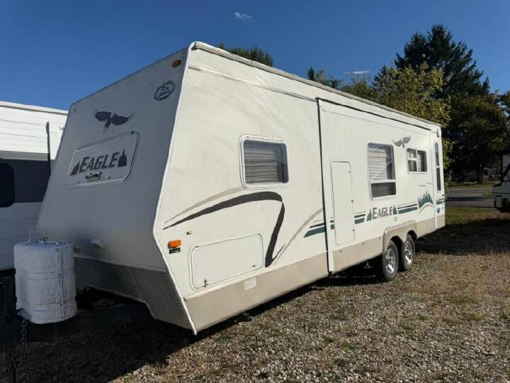 2004 Jayco Eagle 278FBS, JAYCO EAGLE (2004) These Typical Features Vary by Model Living Spaces |Patio Light|Retractable Entry Step|Entry Assist Handle|Entry Door Deadbolt|Front Window Stone Guard|Awning Windows|Mini Blinds|Designer Fabric Valances|J-Steel Convertible Sofa (vbm)|Overhead Cabinets|Oak Cabinetry Dining |Dinette|Deep Bowl Sink|Sink Cover Cutting Board|Flush Mount Refrigerator|3-Burner Range and Cover|Range Hood Light Fan|Oven|Microwave Inverter Electronics |Systems Center|LP Detector|Thermostat|Crank TV Antenna Booster|Cable TV Hookup|AM FM CD Cassette|Four Speakers Sleeping |Padded Carpet|Innerspring Mattress|Quilted Bedspread|TV Prep|Overhead Storage|Overhead Reading Lights|Nightstands|Wardrobes|Underbed Storage Struts Bunk Beds (vbm)|Screened Egress Windows Bathroom |Medicine Cabinet Mirror|Vanity Linen Storage|Tub Shower Surround|Toilet|12v Power Vent Mechanicals |Two 30# LP Bottles ABS Cover|30-Amp Service Cord|45-Amp Converter|Auto Ignite Furnace|In-Floor Ducted Heat|13.5k Central AC|6-Gal Hot Water|Water Heater Bypass|Winterization Kit|Bumper Hose Carrier Coach Build |12v Hitch Light|EZ Lube Axles|15-inch Wheels|Goodyear Radial Tires 5/8-inch TG Plywood Deck|Mesa Metal or Fiberglass Exterior|Seamless Aluminum or Rubber Roof|Front Stone Guard|PolyFlex Enclosed Underbelly|Stabilizer Jacks|Lockable Cargo Doors