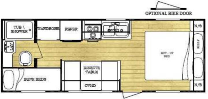 Ameri-Lite Bunkhouse Travel Trailer w/Rear Corner Bath w/Lav., Tub/Shower, Rear Corner Bunks, Wardrobe, Refrigerator, Booth Dinette w/Overhead Cabinets, 3 Burner Range, Double Kitchen Sink, Front Lift-Up Queen Bed w/Nightstands, Opt. Bike Door in Front & More.