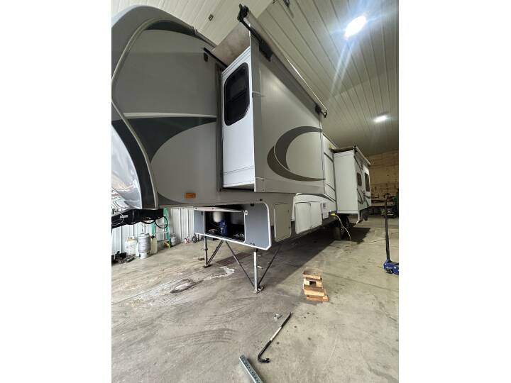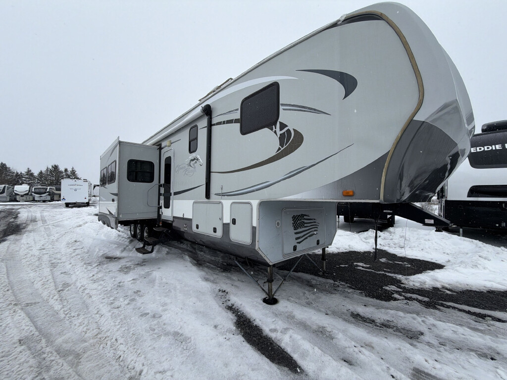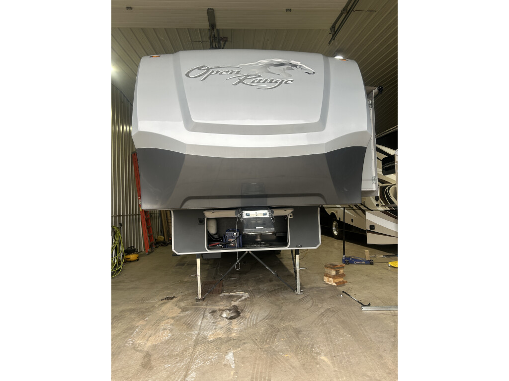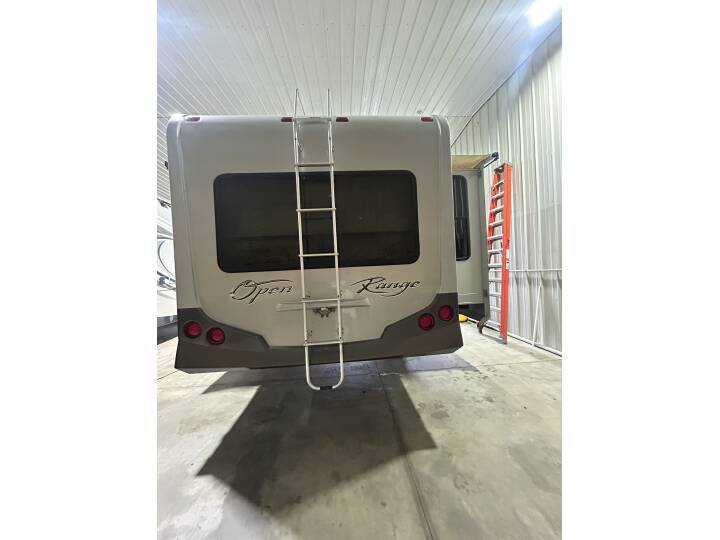 Open Range FW w/Rear Living Area Including 2 Recliners w/End Table Between & Overhead Cabinets, Loveseat/Refrigerator/Pantry & 3 Burner Range Slideout, Double Kitchen Sink w/Overhead Cabinets, Oval Dinette w/4 Chairs & Corner Ent. Center/Hutch Slideout, Step Up to Side Aisle Bath w/Angle Shower, Linen Cabinet w/Washer/Dryer Prep, Vessel Sink, Chest of Drawers, Front Queen Bed Slideout, Mirrored Wardrobe w/Sliding Doors, Shelves, TV and Much More!