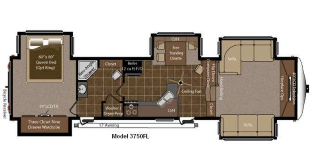 This Fifth-Wheel sleeps 3 people and is available at Camping World in Columbia, MO.