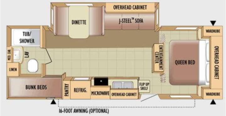 Also Includes: * 1 SLIDE OUT * PATIO AWNING * FRONT & REAR ENTRY DOORS * BOOTH DINETTE * 2 TVS * 2 RECLINER CHAIRS * REAR KITCHEN * FRONT QUEEN BED * POWER TONGUE JACK