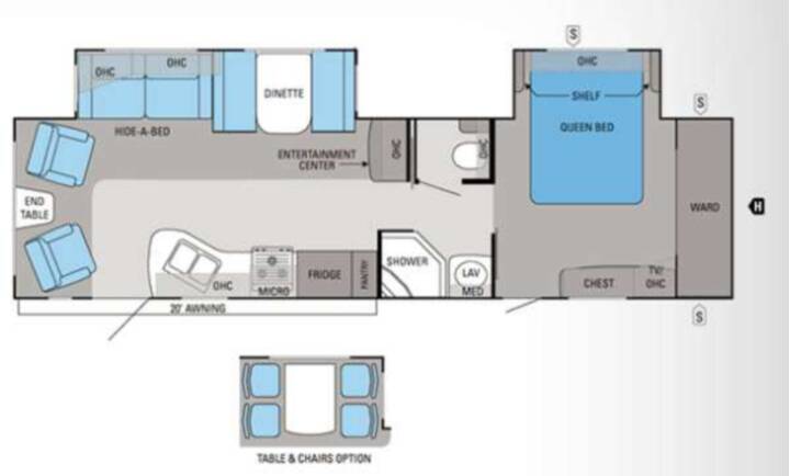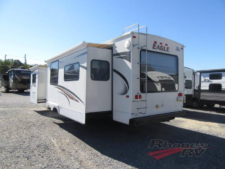 Double Slide Eagle Travel Trailer, Rear Living Area w/2 Chairs, Hide-A-Bed w/Air Mattress/Booth Dinette Slideout, Entertainment Center, Dbl. Kit. Sink, 3 Burner Range w/Micro., Refrig., Pantry, Private Toilet Area, Angle Shower, Lav. w/Med. Cab., Front Queen Bed w/Shelves Slideout, Wardrobe, TV Cabinet & Chest, Overhead Cabinets Throughout, 20' Awning and More! Available Options May Include: Free Standing Table w/Chairs.