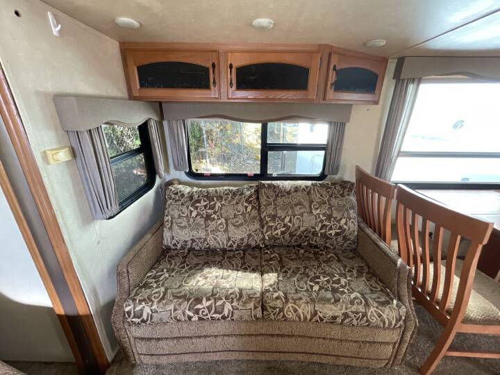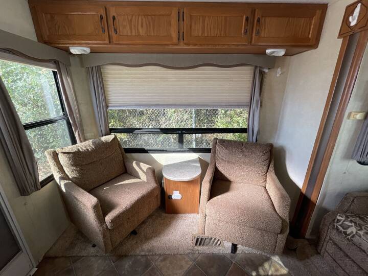 Also Includes: * RECLINER CHAIR * DAY/NIGHT SHADES * GAS/ELEC. WATER HEATER W/DSI * GRAB HANDLE * ELECTRIC PATIO AWNING * EXTERIOR SPEAKERS * FIBERGLASS EXTERIOR * FRONT QUEEN BED * FRONT & REAR STABILIZER JACKS * MICROWAVE * OUTSIDE SHOWER * 2 SLIDE OUTS * OVEN * SPARE TIRE * TV ANTENNA * 2 TVS * 3 BURNER STOVE * 50 AMP SERVICE * BATTERY * BOOTH DINETTE * DUCTED AC * DOUBLE DOOR REFRIGERATOR