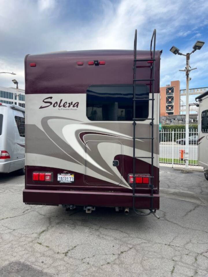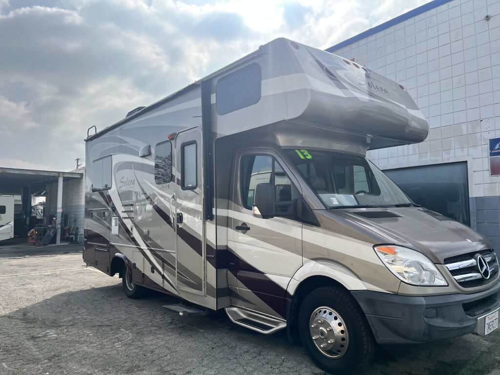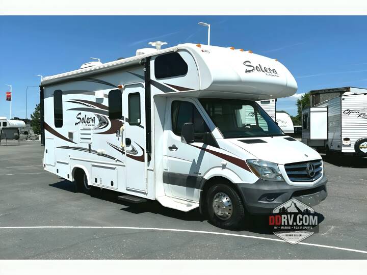 2013 Solera 24S GOLD, 2013 solera 24s specificationsThe 2013 Forest River Solera 24S is a Mercedes-Benz Sprinter-based Class C diesel motorhome, around 24.5 feet long, featuring a single slide-out, sleeping for 4, a rear queen bed, a mid-size kitchen (3-burner stove, oven, fridge, microwave), and a rear bath. Key specs include a 11,030 lb GVWR, 188hp V6 diesel engine, 3,500 lb hitch capacity, and generous fresh, grey, and black water tanks, plus substantial storage, making it efficient and capable. Chassis & EngineChassis: Mercedes-Benz SprinterEngine: 3.0L V6 DieselHorsepower: 188 bhpFuel Capacity: 26.4 gallons Weights & DimensionsLength: Approx. 24' 6"GVWR (Gross Vehicle Weight Rating): 11,030 lbsCargo Capacity: Approx. 1,230 - 1,330 lbsExterior Width: Approx. 7' 8"Interior Height: 7 ft Capacities (Approximate)Sleeps: 4Fresh Water: 35 gallonsGrey Water: 32-33 gallonsBlack Water: 1 tankWater Heater: 6 gallonsStorage Capacity: ~430.7 cubic feet/gallons Features & SystemsSlide-Out: Single, for rear queen bedKitchen: 3-burner stove, oven, microwave, mid-size refrigeratorBathroom: Tub, toilet, sink, medicine cabinetUtilities: Ducted AC, furnace, 3000W generator (LP), 30 amp serviceTowing: 3,500 lb hitch capacityConstruction: Azdel Laminate, Gelcoat Fiberglass, Fiberglass Roof