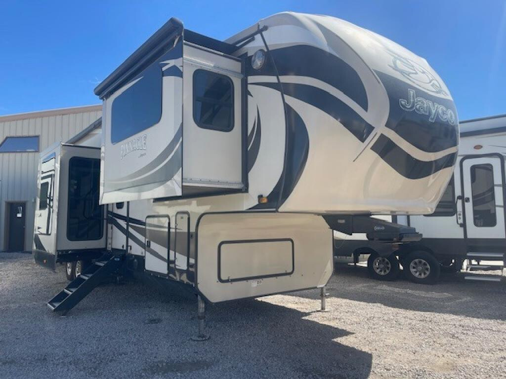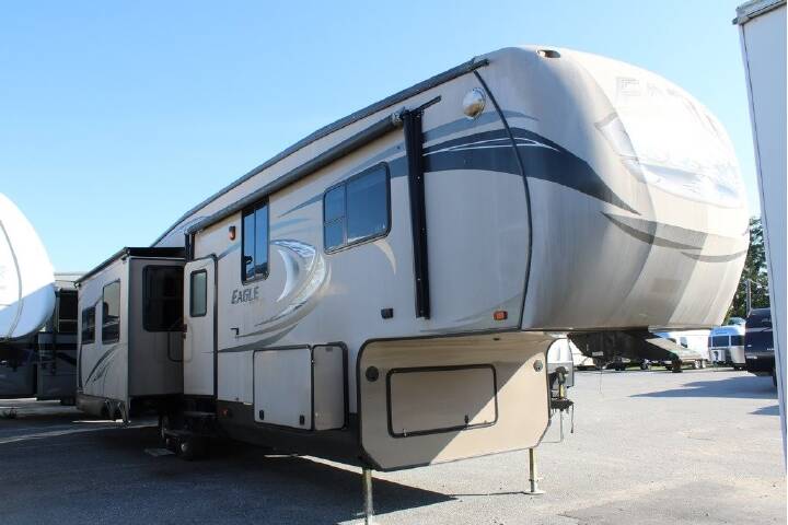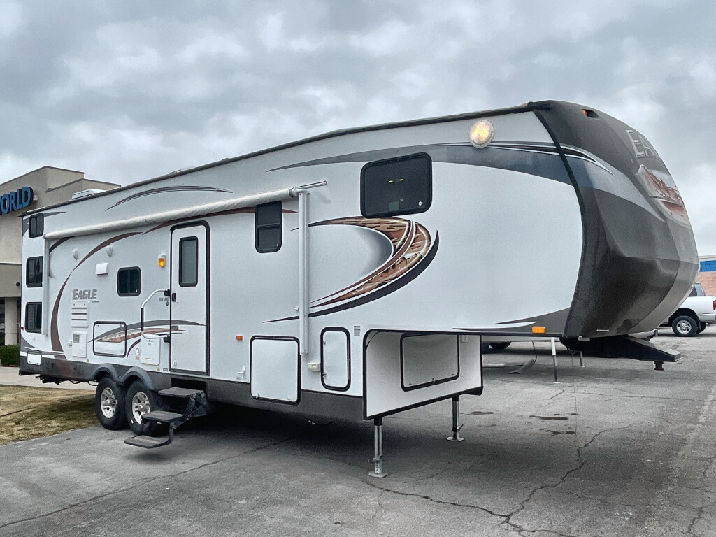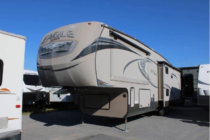 2013 Jayco Eagle 351MKTS, , Basic Information - Year: 2013, Basic Information - Make: Jayco, Basic Information - Model: Eagle, Basic Information - Trim: 351MKTS, Basic Information - Stock Number: 52158C, Basic Information - VIN: 1UJCJ0BU0D1LU0081, Basic Information - Condition: Used, Basic Information - Dry Weight: 11180, Basic Information - Type: Fifth Wheel, Basic Information - Sleeping Capacity: 4, Basic Information - Length (Feet): 39.6, Basic Information - Construction Body Material: Aluminum, Basic Information - Sidewall Construction: Fiberglass, Basic Information - Dry Weight (kg): 5071.2, Basic Information - Dry Weight (lbs): 11180, Bedroom / Bath - Bathroom, Bedroom / Bath - Bathroom Flooring Type: Vinyl, Bedroom / Bath - Bathroom Location: Center, Bedroom / Bath - Bathroom Medicine Cabinet, Bedroom / Bath - Bathroom Mirror, Bedroom / Bath - Bathroom Vent / Fan System, Bedroom / Bath - Full Size Master Bedroom Closet, Bedroom / Bath - Master Bedroom, Bedroom / Bath - Master Bedroom Door Style: Conventional Door, Bedroom / Bath - Master Bedroom Flooring Type: Carpet, Bedroom / Bath - Master Bedroom Location: Front, Bedroom / Bath - Master Bedroom Mirror Doors, Bedroom / Bath - Number Of Bathrooms: 1, Bedroom / Bath - Number Of Queen Size Beds: 1, Bedroom / Bath - Shower, Bedroom / Bath - Shower Door Type: Plastic / Glass, Bedroom / Bath - Toilet, Bedroom / Bath - Toilet Type: Porcelain, Bedroom / Bath - Upgraded Mattress, Cargo / Storage - Pass-Thru Storage, Comfort - Ceiling Fan, Comfort - Air Conditioning (BTUs): 15,000, Comfort - Heater, Comfort - Sofa, Comfort - Recliners / Rockers, Comfort - Number Of Sofas: 1, Comfort - Number Of Recliner / Rockers: 2, Comfort - Number Of Convertible / Sofa Beds: 1, Comfort - Air Conditioning Type: Automatic, Comfort - Recliners / Rockers Material: Leather, Comfort - Sofa Material: Leather, Comfort - Heater (BTUs): 35000, Comfort - Heater Type: Automatic, Convenience - Sky Light, Convenience - Roof Vents, Convenience - Leveling Jack Type: Front Manual / Rear Power, Drivetrain - Number Of Axles: 2, Electrical / Generator - Exterior Plugs, Electrical / Generator - Ground Fault Plugs, Electrical / Generator - Battery, Electrical / Generator - Voltage Meter, Electrical / Generator - Water Pump Power Display, Electrical / Generator - Air Conditioning Prewiring, Electrical / Generator - Heat Prewiring, Electrical / Generator - Battery Converter Amps: 90, Electrical / Generator - Battery Power Converter, Entertainment - CD Player, Entertainment - CD Number Of Discs: 1, Entertainment - DVD Player, Entertainment - Television, Entertainment - Radio, Entertainment - Speakers, Entertainment - TV Antenna Prewiring, Entertainment - Cable Prewiring, Entertainment - Surround Sound, Entertainment - Satellite Prewiring, Entertainment - Number Of Radios: 1, Entertainment - Number Of Televisions: 1, Entertainment - Speaker Location(s): Interior, Exterior - Exterior Flood Lights, Exterior - Exterior Ladder, Exteri