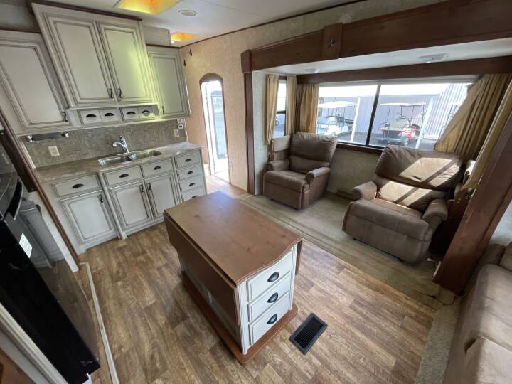 Also Includes: * 2 RECLINER CHAIRS * U-SHAPED DINETTE * REAR LIVING ROOM * 3 BURNER STOVE * FRONT QUEEN BED * FIBERGLASS EXTERIOR