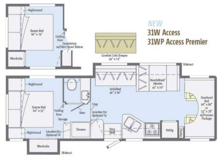 Winnebago Access Premier w/Rear Queen Bed w/Nightstands, Slideout Wardrobe, Storage Cabinet, Shower, Private Toilet Area w/Vanity & Sink, Folding Door Between Bedroom & Bath, Step Up to Bed & Bath, Sofa Bed/BenchMark Dinette Slideout, Over Cab 53 x 78 Cabover Bed, Pantry, Refrig., 3 Burner Range, Dbl. Kitchen Sink, Overhead Storage and Much More! Available Options May Include: Bedroom Option w/o Ward. Slide, Comfort Sofa Sleeper IPO Sofa Bed, Bedroom TV, Mid-Ship TV.