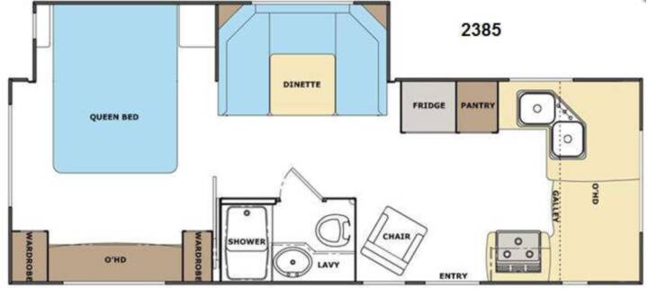 Across from the dinette there is a full bath including a toilet, vanity with sink, and tub/shower. On the exterior of the bathroom wall facing the dinette you can add an optional 32" LED HDTV for your enjoyment.