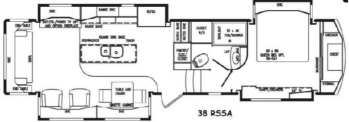The opposite slide features the kitchen appliances and the living room entertainment center with power lift TV including an optional fireplace below. In the kitchen area you will find a refrigerator, a three burner range, counter space, and overhead storage in the slide. The convenient island provides more counter space, plus a dishwasher, double sinks, and trash container. Off to the side of the island there is a hutch with upper and lower storage, plus a pantry and electrical closet.