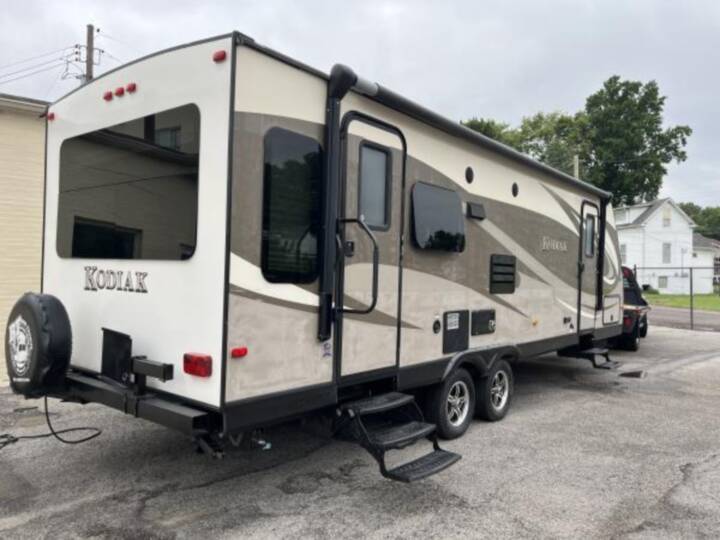 2015 Keystone Dutchman Kodiak 263 RLSL; length 31', 1 slide-out; sleeps 6; dry weight 5806; hitch weight 697; fresh water tank 52 gal; 2 20lb LP tanks w/cover; power awning; 3 burner stove w/oven; electric or propane 2 door refrigerator/ leatherette sofa & recliner chairs; corner shower w/glass door; aluminum wheels; spare tire; roof AC; electric/propane water heater; Furrion AM/FM/CD/MP3/Clock/Clock/Alarm/Aux/DVD/USB/Bluetooth; TV in master bedroom TV in living area/ stock #5174 MB Thomas RV Sales 314-631-5600