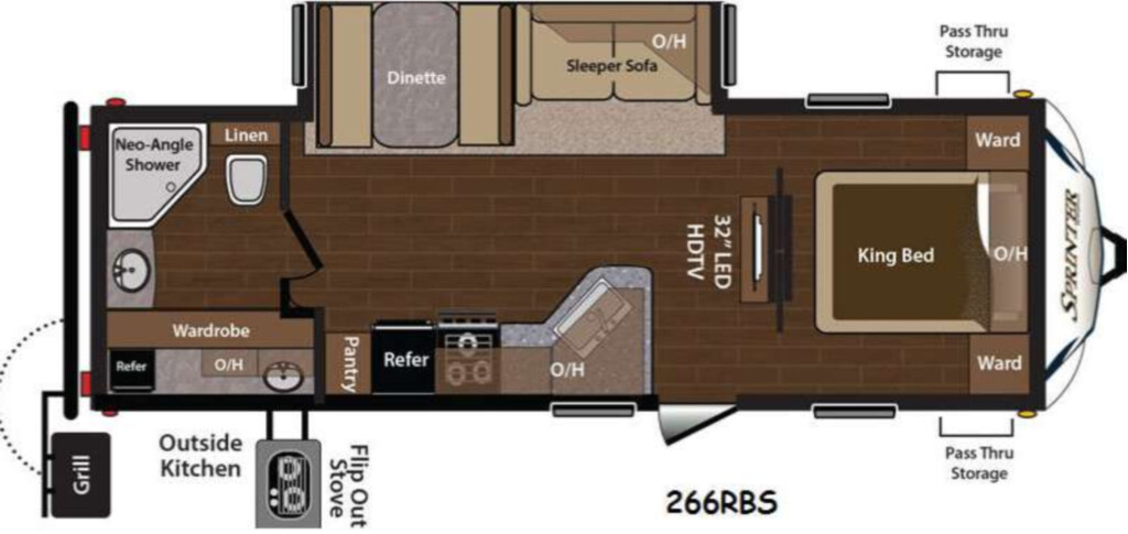 Step inside and find a 32" LED HDTV straight in from the door just beyond the front king bed. There are sliding doors on either side of the entertainment center that lead into the front bedroom. There is plenty of storage space with wardrobes on both sides of the bed and an overhead storage cabinet above.