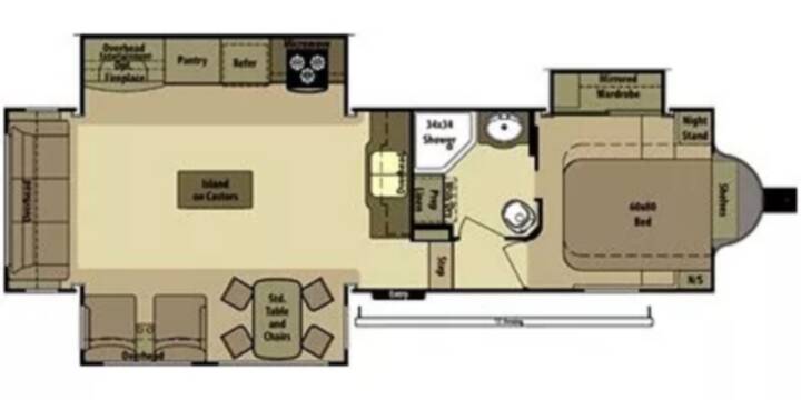 Rear living layout: Includes a fireplace for added warmth.