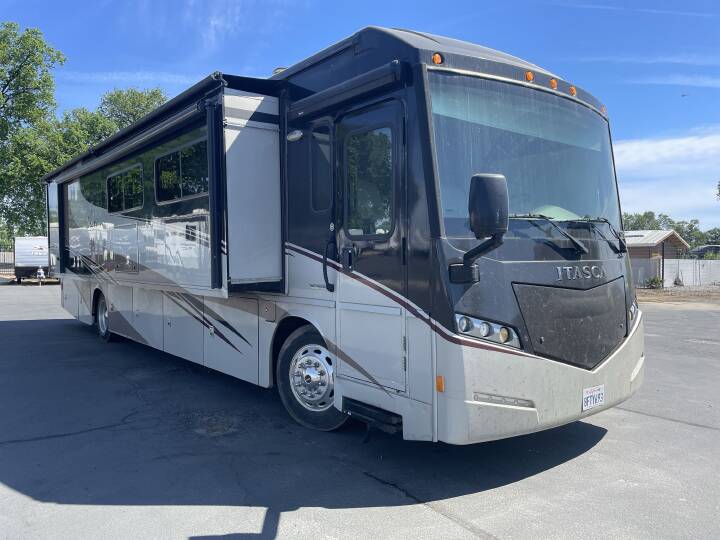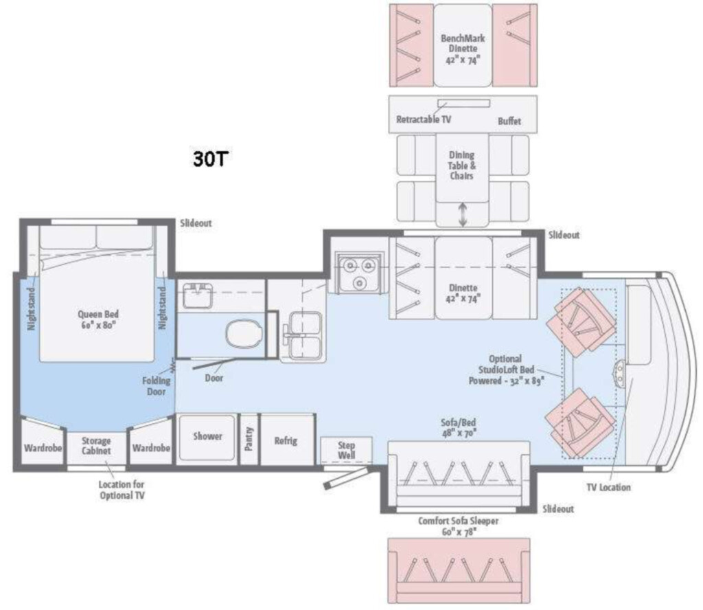 Itasca Sunstar LX class A gas motor home 30T features triple slides for added interior space, sleeping for six, and all the amenities you need while traveling.This class A coach features a wide open living area with dual opposing slides just behind the front cab seats that can swivel toward the rear for added seating. The slide to the right of the side entry door features a 48" x 70" sofa bed, or you can choose the 60" x 78" Comfort Sofa Sleeper. On the opposite side there is a slide out three burner range, and 42" x 74" booth dinette with seat belts. You can also select the optional dining table and chairs with buffet featuring a 40" retractable TV, or a BenchMark Dinette instead. A refrigerator is located to the left of the entry door along with a pantry for storage, opposite the dinette slide is a double sink, plus overhead cabinets for all of your dishes and things.Head toward the rear bedroom and pass by a shower on the left and private toilet area with vanity and sink including overhead storage on your right.A folding door gives the rear bedroom a bit of privacy. There you will find a queen bed slide with nightstands and overhead storage, plus wardrobes and a storage cabinet where you can also add the optional TV, plus so much more!