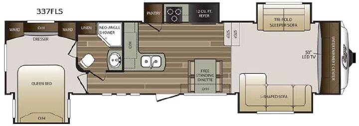 This Cougar fifth wheel 337FLS by Keystone RV features quad slides, a front living area, and a rear master bedroom. Step inside and find yourself in a spacious retreat with a large center kitchen. There is a free standing dinette to your right as you enter. Straight ahead is a L-shaped counter with a double sink, overhead cabinets, and counter space. The slide out on the curb side features a large pantry, three burner range, and a 12 cu. ft. refrigerator.Step up to a front living area with slide out tri-fold sleeper sofa on the left, a full front wall entertainment center with storage, and a second slide out L-shaped sofa for ample seating to watch your 50" LCD TV, entertain guests, or just hang out.Move to the rear of this fifth wheel and find a full bath with a toilet, sink, neo-angle shower, and linen cabinet. The rear private bedroom features a queen bed slide with overhead storage, dresser and wardrobes on the opposite side, plus access to the bathroom from within the bedroom, and so much more!