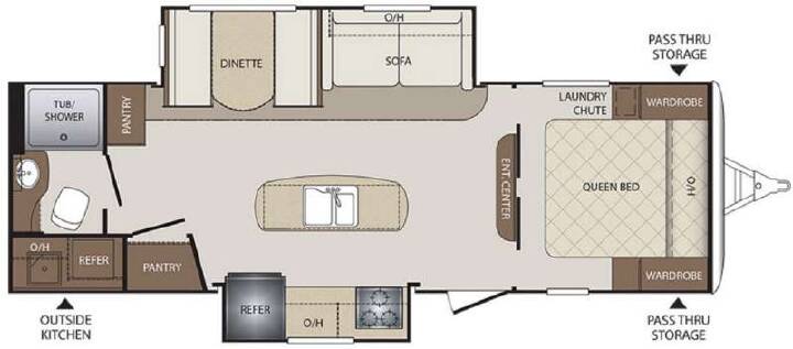 It's time to enjoy the great outdoors in this dual slide Bullet travel trailer by Keystone RV. Model 265RBIWE features a rear bath, kitchen island, front bedroom, plus an outside kitchen and more!Step inside to see a spacious interior with dual opposing slides in the living and kitchen area. The first slide out includes a sofa and booth dinette. The opposite slide out has the kitchen amenities. There is a three burner range, counter space, overhead cabinets, and a refrigerator. Next to the slide is a large pantry for your non-perishables. A much desired kitchen island includes a double sink for easy clean up and extra counter space plus storage. A second pantry is next to the dinette.Along the center interior wall is an entertainment center that can easily be viewed from the kitchen/living space.The front bedroom features a comfortable queen bed, dual wardrobes, overhead storage space, a laundry chute, and dual sliding privacy doors too.The rear full bath includes a tub/shower, sink with medicine cabinet and vanity, linen storage, and a toilet.When it's time to eat outdoors the outside kitchen with a single sink, refrigerator, and counter space, plus overhead storage will become your favorite hang-out location.
