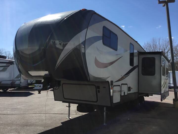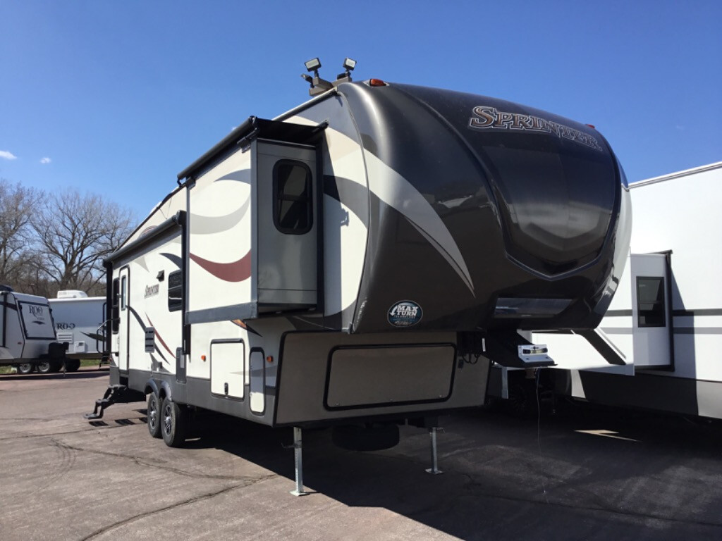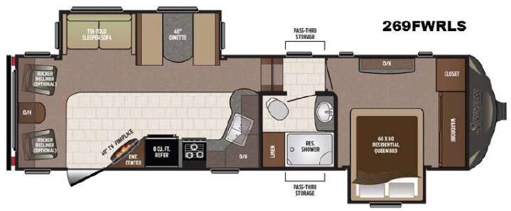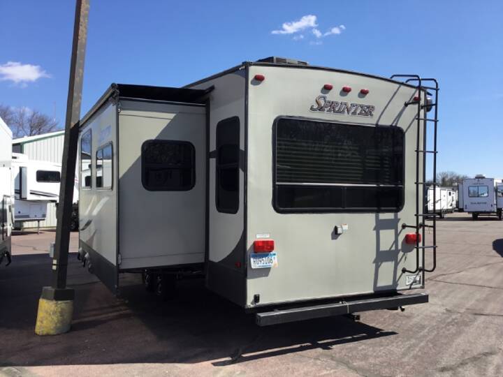 This Sprinter fifth wheel model 269FWRLS features a wide body design with an 8'4" width for added space. You will enjoy a rear living layout, double slides with the living area slide being 42" deep, and a fireplace also!Step inside and be greeted by a wide open living area featuring two swivel rocking chairs along the rear wall that also includes a end table and overhead storage cabinets. You can choose two optional rocker recliners instead. There is a tri-fold sleeper sofa and booth dinette slide opposite the door side. Enjoy the entertainment center featuring a 40" TV and fireplace just to the right of the entry door for your inside camping days.The kitchen features everything needed to create meals and snacks while away from home. There is a refrigerator, three burner range, a counter space for food prep, and a large kitchen sink. You will also find plenty of overhead storage for dishes and things.Step up to a side aisle bath and front bedroom. The bath features a residential shower, toilet, sink, and linen cabinet.The private front bedroom features a slide out residential queen bed with overhead storage on the opposite side, and a full front wardrobe with sliding doors, a closet, and so much more!