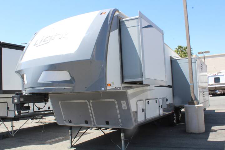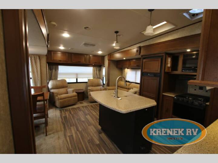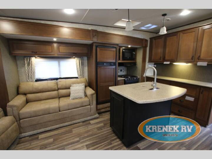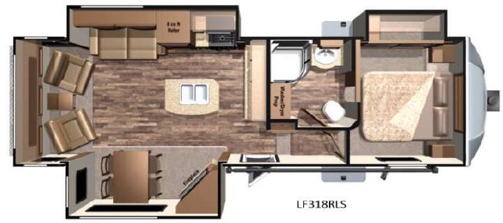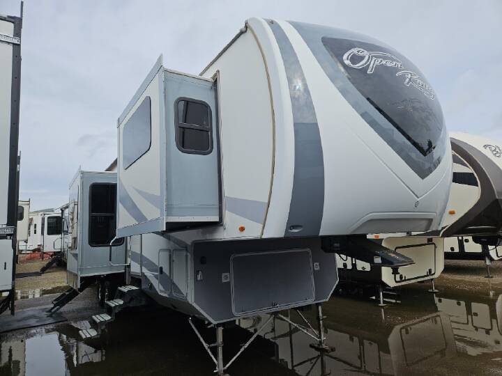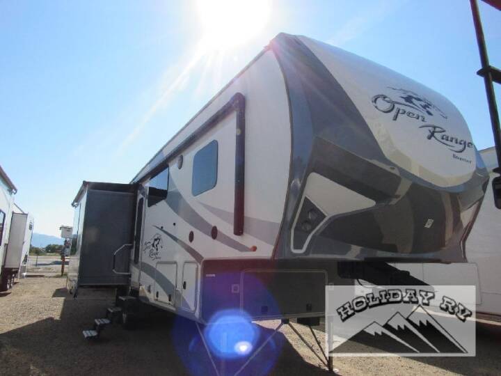 Step inside this Highland Ridge Open Range Light fifth wheel model 318RLS and see how easy it will be to enjoy every future camping trip you plan. This unit features a rear living layout, triple slides for added interior space, and a convenient kitchen island, plus more!Notice the cabinets across from the entry door as you step inside. The step up to your right will take you to the full bath and front master suite. The bath features a radius shower, toilet, sink, and linen cabinet that has been prepped for a washer and dryer that you could choose to add. The bath also features dual entry with a pocket door that leads right into the front bedroom.Get a great nights sleep on the queen bed provided in the private front bedroom including nightstands with open storage below including a cargo net, plus a slide out wardrobe with mirrored doors. There are also added drawers in the slide for your things, and storage shelves above the bed too.Back down in the main living space you will enjoy the open feel that the dual opposing slides create. The slide on the left passed the front entry door features a dining table with chairs, and an entertainment center with a fireplace below. There are two recliners along the rear wall with an end table between, plus overhead storage the entire width of the unit. The second slide opposite the door offers a sofa with overhead cabinets, and kitchen amenities such as a refrigerator and three burner range with microwave above. The kitchen island features a double sink with optional bar stools, and there is more overhead storage and counter space along the interior wall, plus so much more inside and outside this fifth wheel!