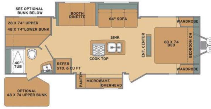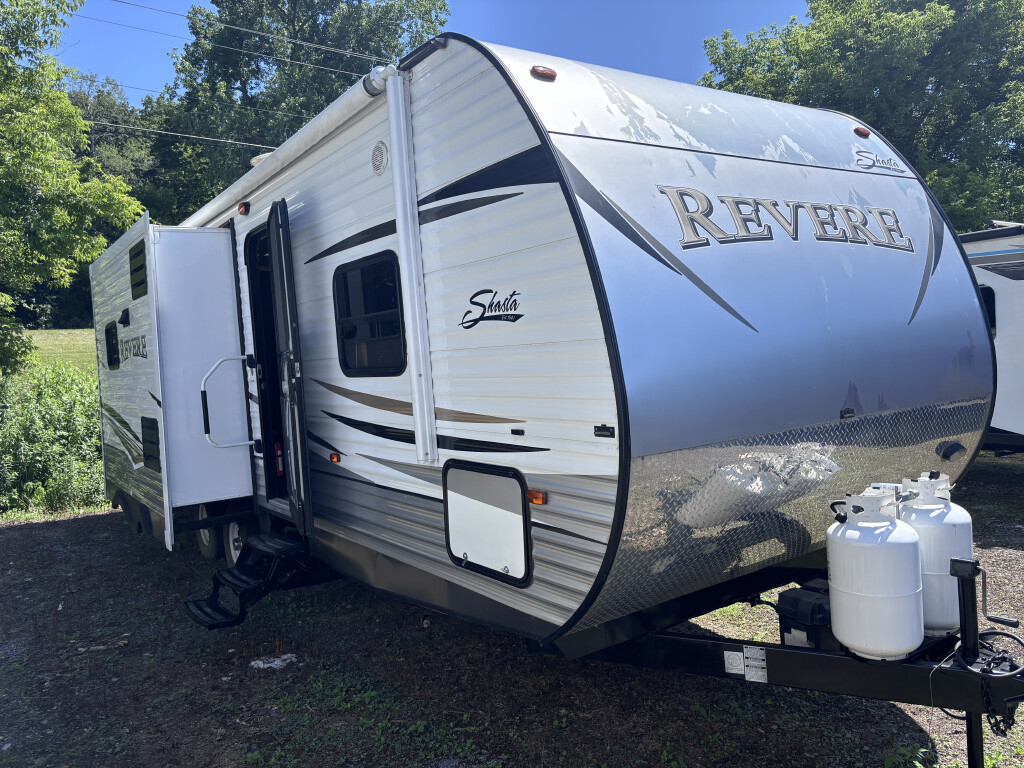 This Shasta Flyte bunkhouse travel trailer features a rear bath layout, dual slides, double entry doors, and a convenient kitchen island, plus so much more!Step into model 285BK and notice how open the interior feels with double slides opposite one another in the main living area. There is a kitchen slide out to the left of the main entry that features counter space with storage both above and below along with a microwave oven overhead. There is also a closet/pantry for dry and canned good storage above convenient drawer space. The island features a three burner range, a double sink, plus more storage. A 6 cu. refrigerator can be found just off the slide out to help keep your perishable items cold and fresh.The slide opposite the door side features a sofa and booth dinette. Both provide ample seating and a place to enjoy your meals at. An entertainment center is found straight in the main center entry door, just off the foot of the bed. This provides a place to add a TV for viewing and features storage space below. A queen bed up front features overhead reading lights, and dual bedside shirt wardrobes on either side providing a comfortable place to rest up for another day of adventure.The rear of this Flyte travel trailer provides you with a 48" x 74" lower bunk with a 28" x 74" upper bunk above. Or, you can choose the optional second 48" x 74" bunk in place of the twin bunk overhead.In the opposite corner from the bunks find a complete bath with private entry which makes it convenient to access when enjoying the outdoors. Inside the bath find a 48" tub/shower, toilet, and vanity with sink.You will also love the pass-through storage for all of your outdoor camping gear, and so much more!