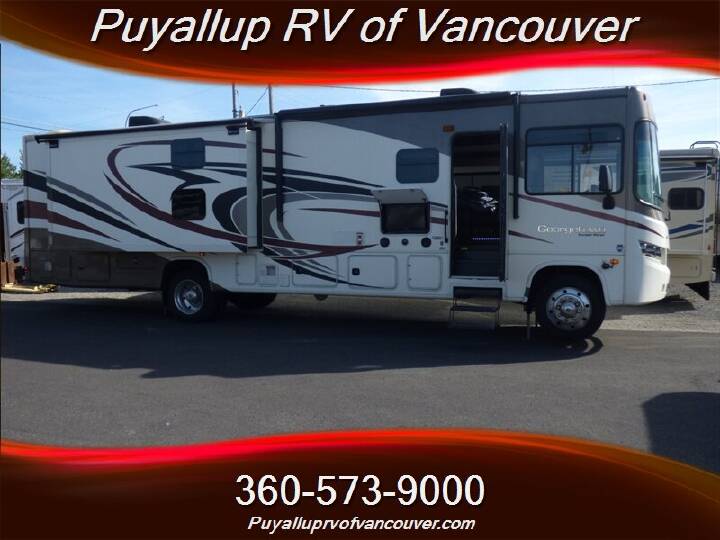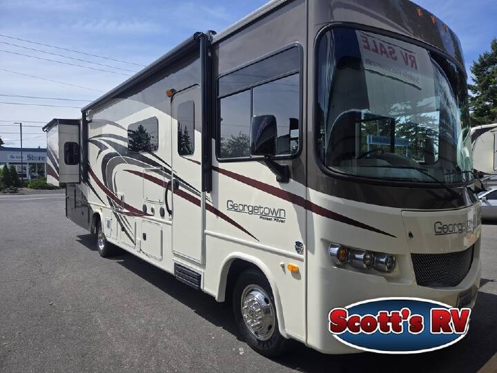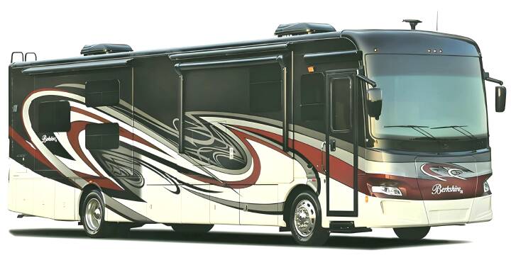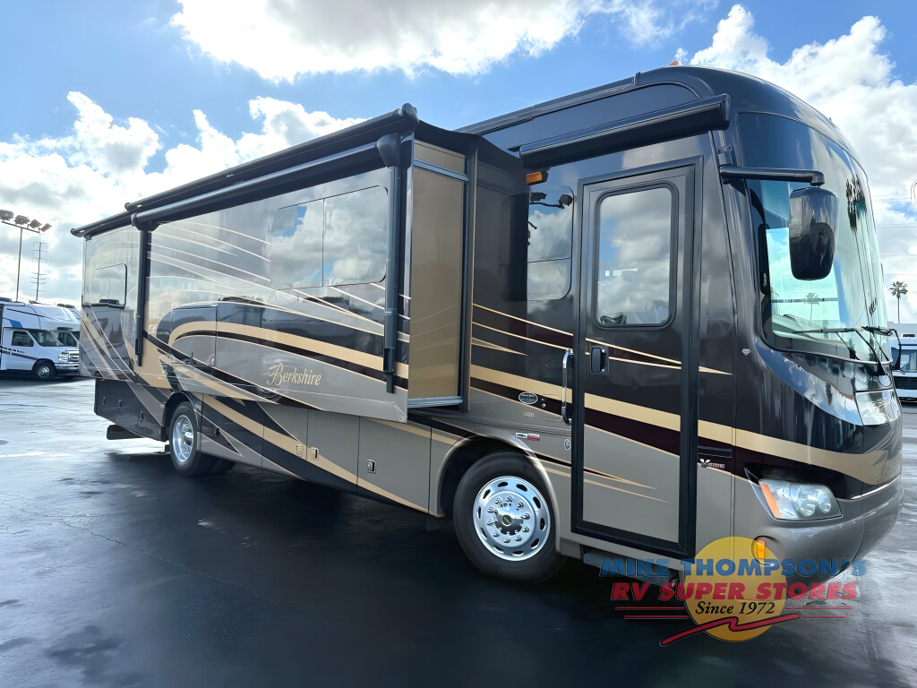 This Berkshire 34QS motor home by Forest River features quad slide outs and a comfortable amount of living space.As you enter the motor home, on the left side there is a slide out with a booth dinette, double kitchen sink, three burner range, microwave, overhead cabinet, and residential refrigerator. Across from the booth dinette you will find a slide out with a sofa, overhead cabinet, and adjacent to the slide there is a 40" LED TV.The bathroom has a corner shower, toilet, sink, medicine cabinet, and linen cabinet which is great for storing towels or toiletries.The rear bedroom has a king bed and overhead cabinet which is located within the slide out. Across from the bed you will find another slide out with a chest of drawers, 32" LED TV, and overhead cabinets with shelves. Along the rear wall there is a wardrobe which provides great storage. In the corner of the room you will also find an area that has been prepped for a two piece washer and dryer, and much more!