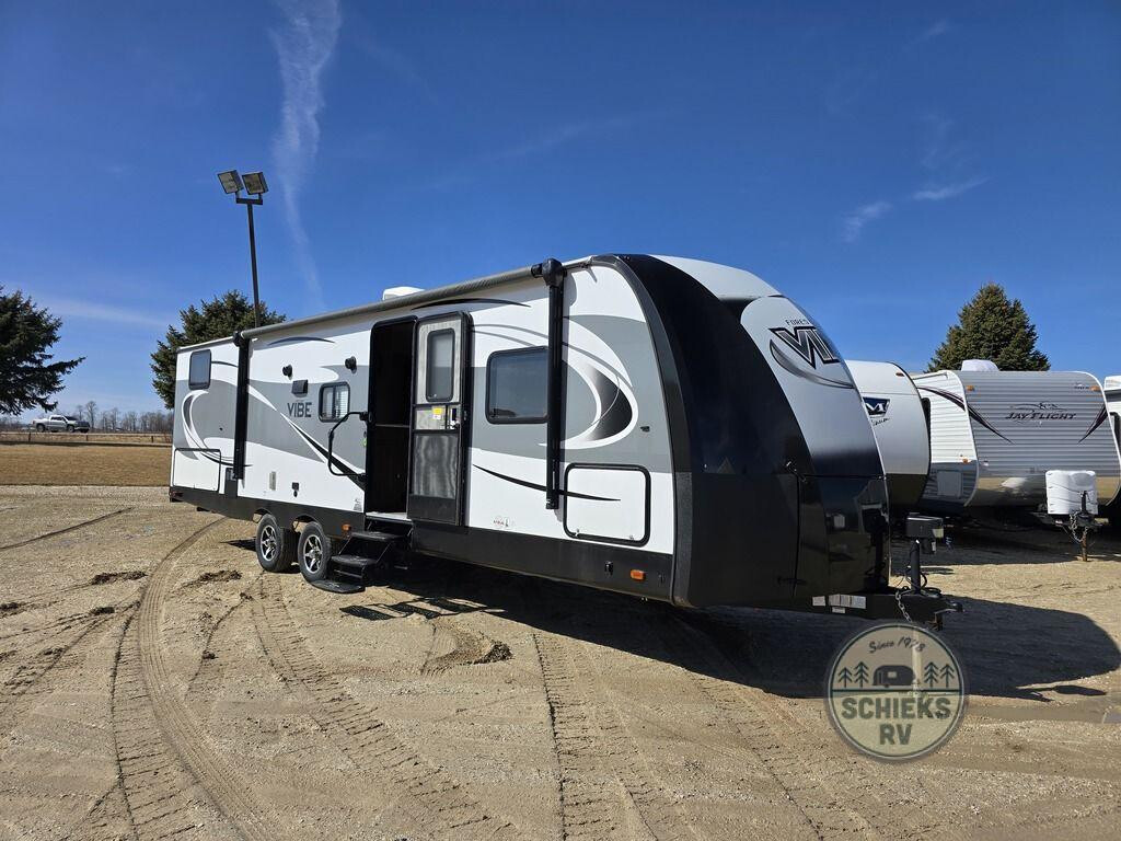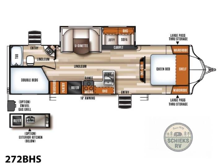 The Vibe 272BHS travel trailer by Forest River offers a single slide out, a rear bunk house, and dual entry doors.As you enter the travel trailer, to the left there is a double kitchen sink, three burner range, microwave, refrigerator, pantry, and wardrobe. Along the opposite side of the trailer you will find a slide out with a u-dinette and a jiffy sofa. Along the front of the living area you will enjoy the entertainment center.In the front bedroom there is a queen bed, wardrobes, and a shelf for extra storage.As you proceed toward the rear of the travel trailer, the double bed bunk house is on the left side. On the right side of the trailer is the bathroom. Inside the bathroom you will find a toilet, tub, sink, and medicine cabinet. There is also a private entrance from the bathroom leading outside.Outside you can enjoy the optional exterior kitchen which includes a sink, refrigerator, and counter space. There is also an optional swivel gas grill that you can choose for your trailer. Find the exterior pass through storage area super handy for all of your extra camping gear, and more!