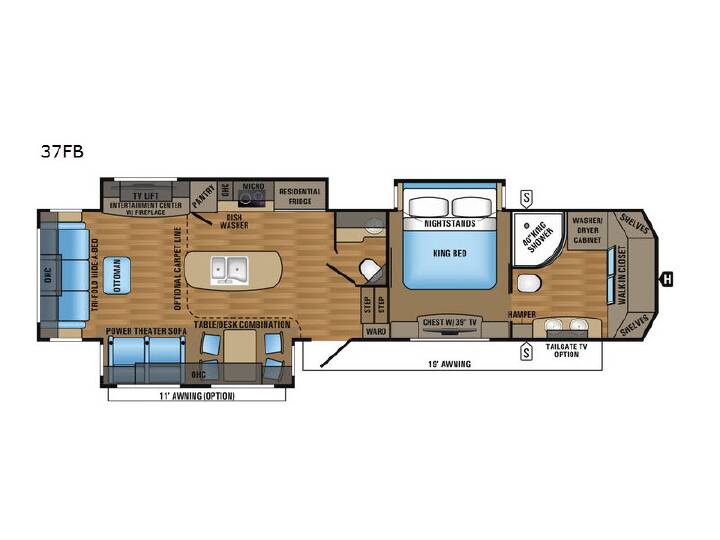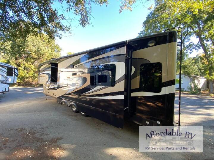 2017 Jayco Designer 37FB, Enjoy one and a half baths, a king size bed and shower, dual sinks in the master bath, triple slide outs, and a wide open layout in this Jayco Designer luxury fifth wheel! Model 37FB is a perfect coach for those who enjoy traveling in comfort and style.Enter and find an open concept kitchen and living area with dual opposing slide outs. There is a table/desk combination with chairs and a power theater sofa for two along the curb side slide out. Along the opposite side you will find a second slide out that contains the kitchen appliances and an entertainment center with a TV lift including a fireplace below.You will easily be able to prepare and cook your favorite light meals and snacks with the two burner stove top and microwave oven. There is a residential refrigerator for your perishables, and a pantry for dry and canned items. Plus a residential dishwasher comes in handy.The rear of this Designer fifth wheel features a tri-fold hide-a-bed with storage above, and end tables on both sides, plus an ottoman.A convenient half bath is located in the living area, straight in from the entry door which makes it easily accessible when coming in from outside. Up front take two steps up beside a side wall wardrobe to a master bedroom and en suite bath. The bedroom area features a king bed slide out with nightstands along the road side. Opposite enjoy a chest of drawers with a 39" TV. A space saving door in the bedroom leads into the front master bath which includes a 40" king shower, a toilet, a washer/dryer cabinet if you choose to add the stackable units, a hamper, DUAL vanity sinks, plus a large front walk-in closet including shelves.On the outside of this unit you will enjoy storage for all of your outdoor camping gear, plus a 19' awning for a bit of outdoor living space, and so much more! FAMILY-OWNED AND OPERATED SINCE 96'. BUY WITH CONFIDENCE FROM A DEALERSHIP THAT SERVICE WHAT WE SELL AND WHERE CUSTOMER SERVICE IS #1 BEFORE, DURING, AND AFTER THE SALE!!