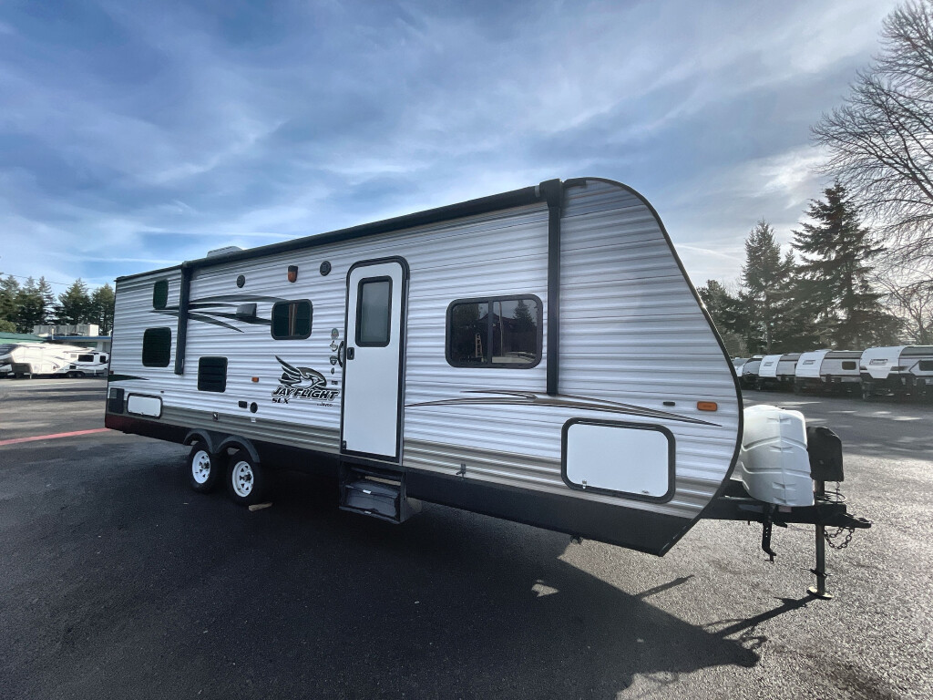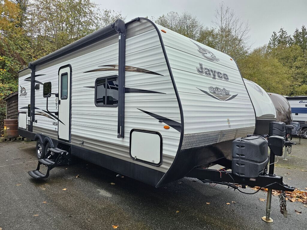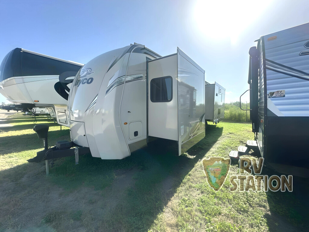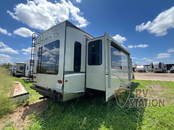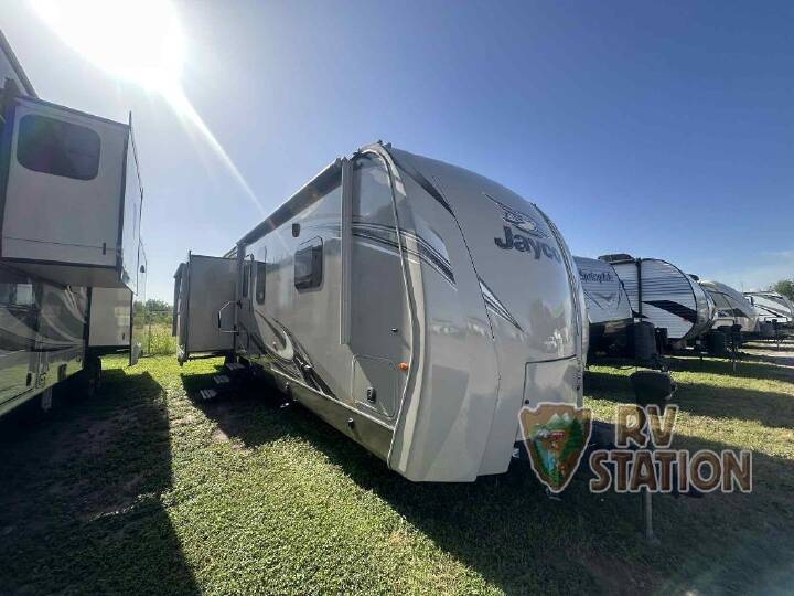 If you are in the market for a travel trailer with triple slide outs, and a rear living area which offers plenty of space to entertain, then take a look at this Eagle 320RLTS travel trailer by Jayco.Almost straight in from the entry door is the bathroom with a shower, sink, medicine cabinet, linen cabinet, and a toilet. There is also a convenient door which leads you into the front bedroom from the bathroom.The front bedroom features a slide out with a queen bed, shelves, and an overhead cabinet, or if you prefer a bit more sleeping space, then you can choose the optional king bed. Easily store you clothes in the dresser, and above there is an optional TV. Along the front wall you will find a wardrobe and a storage area which has been prepped for a washer and dryer.Heading toward the rear, you will find along the interior wall a double kitchen sink, overhead cabinets, and plenty of extra counter space. The kitchen and living area have dual opposing slide outs which help to open up the floor space on this model. The slide out along the door side features a pantry, an entertainment center with a fireplace below, and a dinette or you can choose an optional table and chairs. Along the opposite side of the trailer is where you will find the kitchen appliances such as the microwave, three burner range, pantry, and refrigerator or you can choose an optional 12 cu. ft. or 23 cu. ft. refrigerator depending on your needs. The optional rolling island can easily be moved to where you need it, and is a great spot to fix your meals.Also within the slide out there is a tri-fold sofa and overhead cabinet. Along the rear wall of this model you will find two recliners and more storage in the full width overhead cabinet.Outdoors you can enjoy the outside kitchen area with a refrigerator and a two burner range, also there is an optional 10' awning over the rear half of the trailer, and a 16' awning over the front half of the trailer, plus so much more!