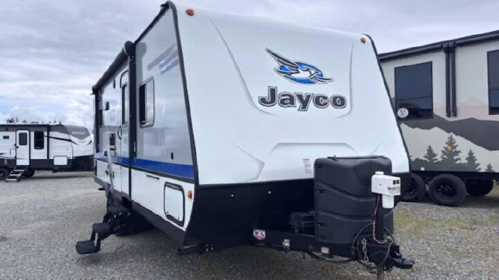 Additional highlights include dual 30‑lb propane tanks, rear ladder, pass‑through storage, and Jayco's Magnum Truss roof system for durability.