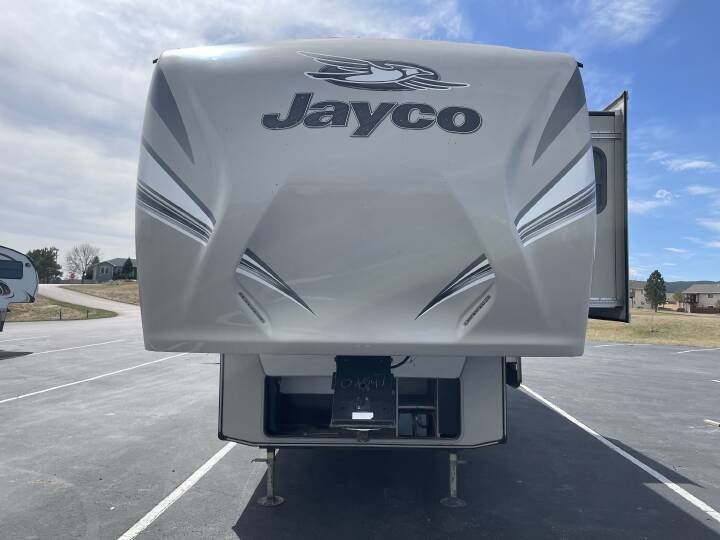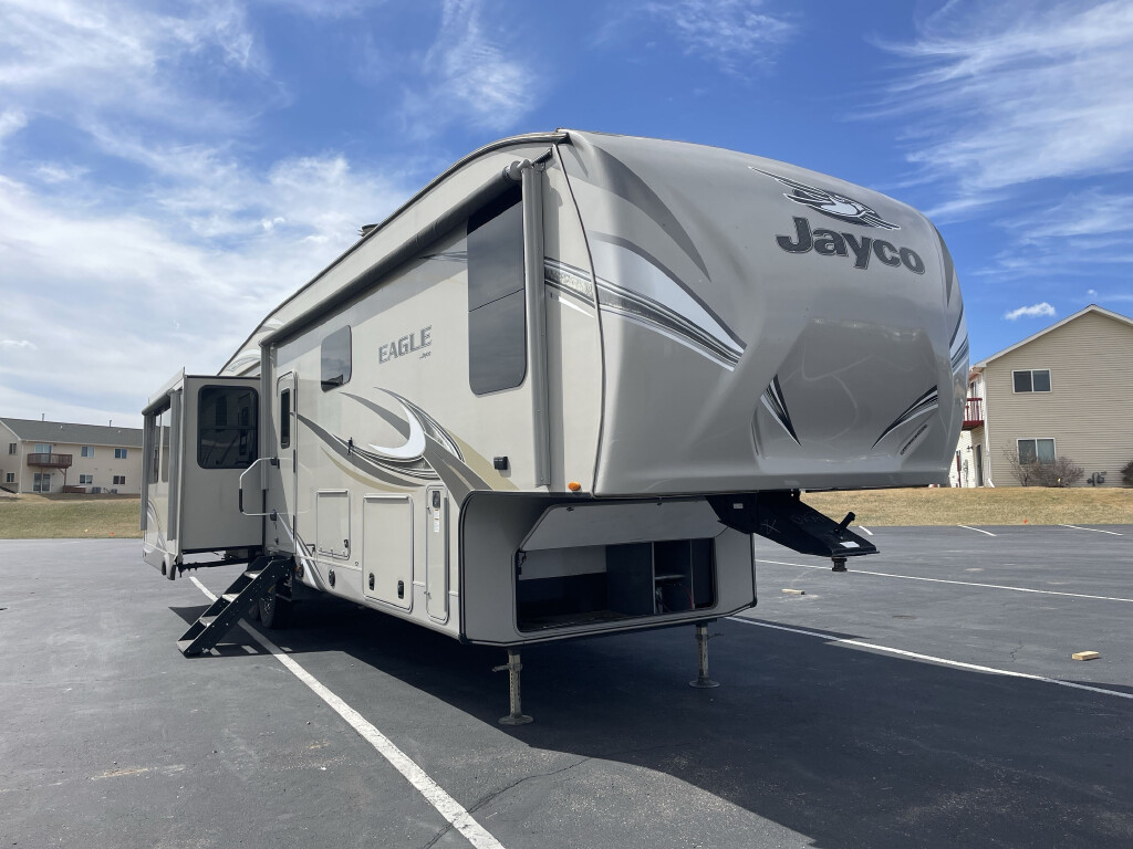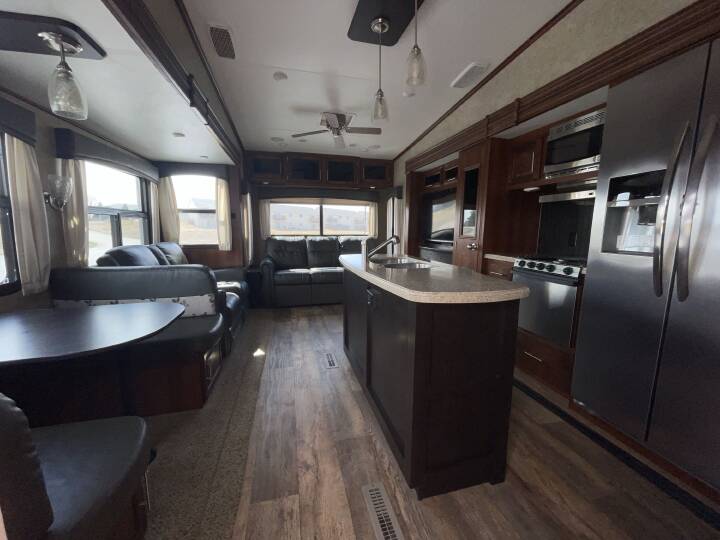 This Fifth-Wheel sleeps 9 people and is available at Camping World in Summerset, SD.