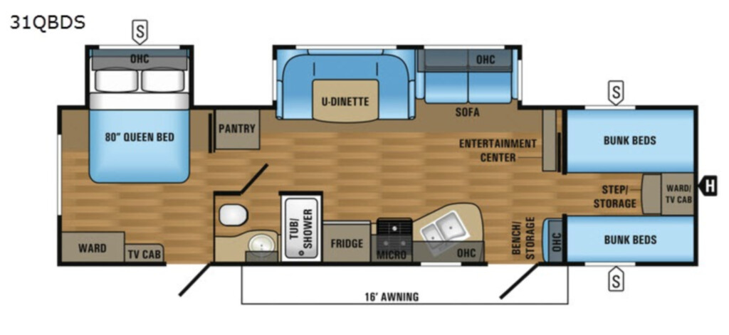 In the main living/kitchen area there is a bench storage and entertainment center along the split interior wall. The road side slide has a sofa, or an optional a hide-a-bed, and a u-dinette. Next to the dinette you will find a large pantry which offers great extra storage.In the centrally located curb side bathroom there is a tub/shower, sink, medicine cabinet, and toilet.The rear bedroom has a queen bed slide, a wardrobe, and TV cabinet. There is also a private entrance/exit leading outside from the bedroom.Your kids will love having their own space in the front bunkhouse. There are two sets of bunks beds, a step/storage, and a wardrobe/TV cabinet.Outside you can even choose an optional kitchen which has a refrigerator, sink, and two burner cooktop. Storage isn't a problem with all of the exterior compartments. You will also find an awning which provides much shade, and more!
