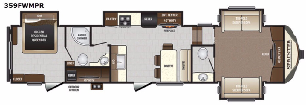 As you enter the main entrance of model 359FWMPR you will find the kitchen sink with counter space on both sides of the sink, and overhead cabinets to your left. To your right of the entry there is a dinette table with booth seating on one side and three tall chairs. Straight ahead you will see a large slide out including a pantry, three burner range, refrigerator, and an entertainment center with a 40" HDTV and fireplace below.