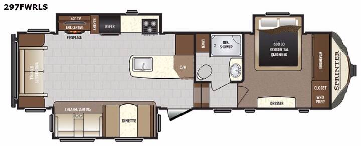 This Keystone Sprinter features a wide body design with triple slides which increases the size even more when all slides are fully extended. You will love the rear living layout with a cozy electric fireplace nearby too.Enter model 297FWRLS and head up the steps on your right to the front master bedroom and side aisle bath. The bathroom offers a residential shower, toilet, sink, and linen cabinet. The private master bedroom at the end of the hall features a slide out residential queen size bed. There is also a dresser opposite, plus a front wall wardrobe and closet prepped for a washer/dryer for all of your clothing and storage needs.Head left at the entry door and find a booth dinette and theater seating slide out. There is more seating across the rear of this Sprinter with a tri-fold sleeper sofa including an end table on each side. Adjacent to the sofa enjoy a slide out entertainment center with 40" TV including an electric fireplace beneath.The kitchen provides everything you need to prepare and cook food for your family. There is a large L-shaped counter area with a sink on the end, and overhead cabinets for all of your dishes and things, plus a slide out along the road side that includes a three burner range and a refrigerator. You will also find a pantry next to the entertainment center within the slide out that is mentioned above, plus so much more!