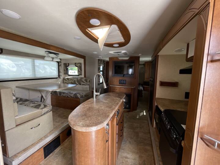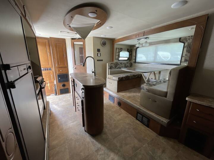 Also Includes: * CENTER KITCHEN * GAS WATER HEATER * FIBERGLASS EXTERIOR * REAR HITCH * POWER TONGUE JACK * FRONT & REAR STABILIZER JACKS * REAR LADDER * DOUBLE SLIDE TOPPERS * OUTSIDE SHOWER * ALUMINUM WHEELS * BATTERY * FRONT QUEEN BED * GRAB HANDLE * ROOF AC * REAR CORNER BATH * DOUBLE DOOR REFRIGERATOR * BOOTH DINETTE * 3 BURNER STOVE * SOLAR CHARGING SYSTEM * TV ANTENNA * ELECTRIC WATER HEATER