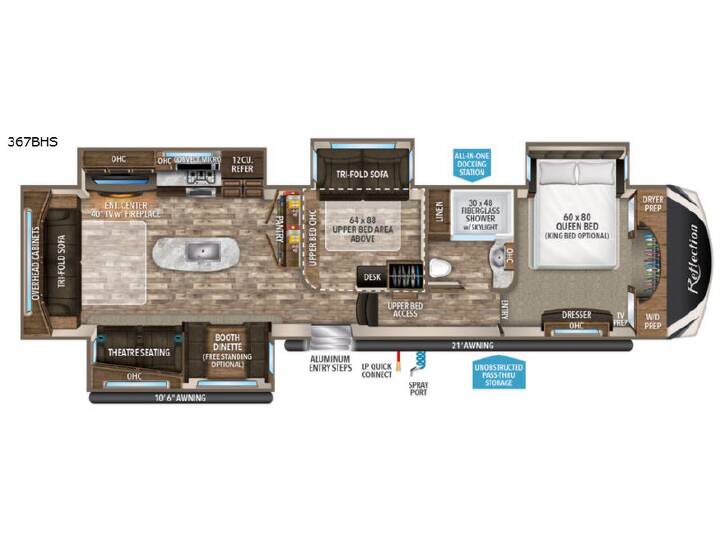 Extra Room Loft 40" TV Fireplace Large Pantry Kitchen Island Farm Sink Have you been searching for a fifth wheel that offers a master suite plus an extra room to be used as an office, second living area or even a bedroom? Then start imagining how you will use all of the space in this Reflection 367BHS. The centrally located extra room includes a sofa and a desk, plus a loft above for more sleeping space. The main living area and kitchen offer plenty of seating, a large pantry, and all the appliances to make your favorite meals. There is even extra sleeping space on the tri-fold sofa next to the 40" TV and fireplace. You will be able to entertain as well as relax in this area or in the extra room. The exterior unobstructed pass-through compartment allows for more outdoor gear to be packed, and the two awnings provide extra protection from the elements. Your search is over, this is the model for you! The Reflection by Grand Design offers luxury along with providing easy towing with the aerodynamic front cap with Max Turn radius to your favorite destinations. The Universal All-In-One docking station, LP Quick Connect, and One-Touch electric awning with LED light make setting up and packing up easy for those weekenders or full-timers that like to move around. Inside you will find the bedroom is complete with a pillowtop queen mattress, king size wardrobe, oversized underbed storage, and much more! The Arctic 4-Seasons Protection package allows you to camp anywhere and anytime of the year. Come choose your favorite model today!