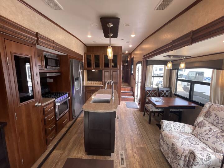 Also Includes: * DUCTED AC * MICROWAVE * OVEN * 3 BURNER STOVE * DOUBLE DOOR REFRIGERATOR * ICE MAKER IN FREEZER * REAR LIVING ROOM * AM/FM/CD STEREO * 2 TVS * TV ANTENNA * FIREPLACE * CEILING FAN * 3 SLIDE OUTS * OPPOSING SLIDES - LIVINGROOM * 2 RECLINER CHAIRS * HIDE-A-BED SOFA * AUTOMATIC HYDRAULIC JACKS * 50 AMP SERVICE * GRAB HANDLE * REAR HITCH * REAR LADDER * GAS/ELEC. WATER HEATER W/DSI * ELECTRIC PATIO AWNING * CHROME WHEELS * SPARE TIRE * SIDE AISLE BATH W/SHOWER * SKYLIGHT ABOVE TUB * KING SIZE BED * WASHER/DRYER COMBO * CENTER KITCHEN * FREE STANDING DINETTE