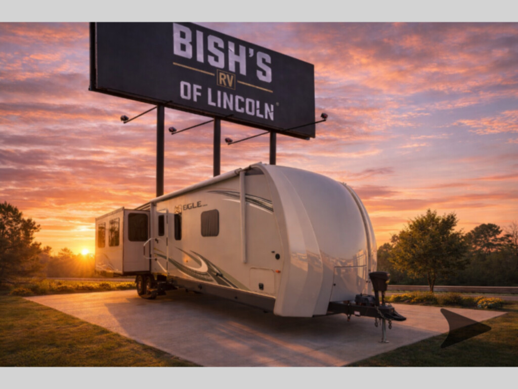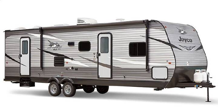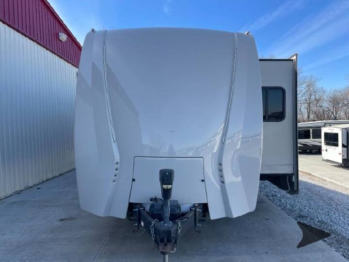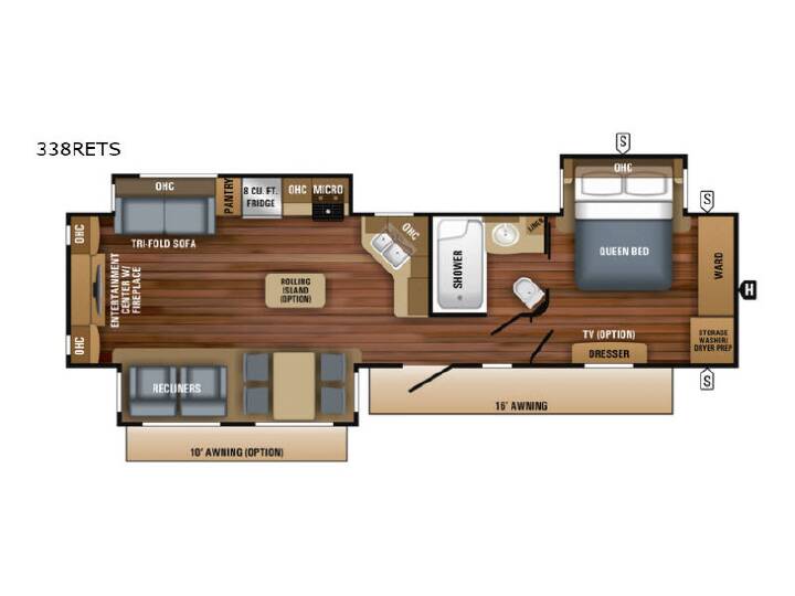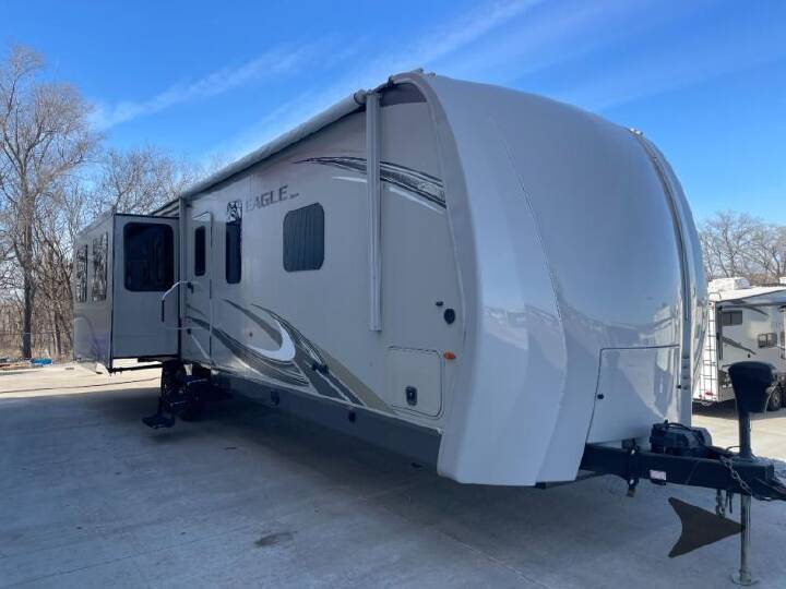 Entertaining friends in this Eagle travel trailer is no problem. Model 338RETS provides a rear entertainment center and an LED fireplace. Just imagine your friends relaxing on the tri-fold sofa or recliners while you prepare snacks on the optional rolling island. You can play cards at the free-standing dinette or watch TV while visiting. When it's bedtime, you can retire to the queen bed while your overnight guests sleep on the sofa or maybe even on one of the recliners. Come see why everyone enjoys traveling in an Eagle. Each Jayco Eagle offers TuffShell exterior walls, a Magnum Truff roof system, and Climate Shield zero-degree-tested weather protection for four seasons of traveling. You will find independent satellite and whole-coach cable hookups, dual USB charging ports in the kitchen and bedroom, and 12V charging stations for your electronic needs. You will love the features on the mandatory Customer Value Package and the Luxury Package including handcrafted, glazed, raised-panel Maple cabinet doors, soft-close residential kitchen drawers, a LG solid-surface kitchen countertop, and the list continues. Come experience luxury and comfort while on the open road in an Eagle. ! No Hidden Fees ! FEATURES - Front Bedroom|Kitchen Island|Rear Entertainment