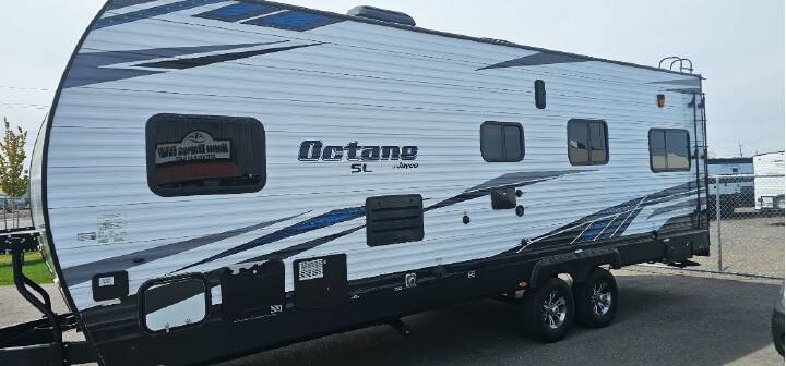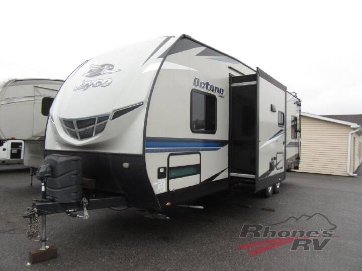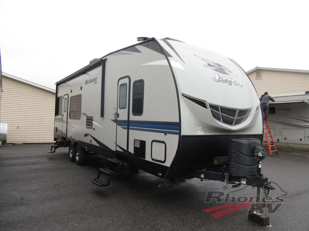 This Octane toy hauler is the perfect compliment to any family in search of a quality outdoor experience. The forty gallon fuel station will allow you to tote along enough fuel to keep all of your gas-powered vehicles filled to the brim, and the ample living space that this toy hauler provides will make each night enjoyable because you will be able to sleep eight people comfortably. The master suite houses a king-sized, Jayco-exclusive Simmons mattress; it also contains a private entrance into the bathroom where you will find a bright and cheery shower skylight. Jayco has designed the Octane toy hauler with the avid adventurer in mind because they have included everything needed for a successful trip to the outdoors. The large cargo area allows you to bring along any of your favorite sporting goods, such as a kayak, bicycle, or even an ATV, and the MORryde CRE3000 suspension system, as well as the integrated A-frame, gives the Octane a sturdy and reliable base for transporting your cargo. The Octane features an outdoor shower so that you can leave nature where it belongs and prevent bringing it inside with you, and the electric awning with LED lights gives you a place to enjoy the fresh air while protected from the elements. GALLEY SLIDE OUT; SMOOTH FIBERGLASS EXTERIOR; ENCLOSED UNDERBELLY; FRONT PARTIAL CAP; POWER AWNING; ALUMINUM WHEELS; STABILIZER JACKS; POWER TONGUE JACK; ONAN 5.5 KW GENERATOR; OUTSIDE SHOWER; ROOF LADDER; FUEL STATION; 50 AMP POWER SERVICE; AM/FM CD PLAYER; 32" LCD TV; ATTIC FAN IN GARAGE; 2 CENTRAL A/C&aposs; 6 GALLON GAS/ELECTRIC WATER HEATER; GLASS SHOWER DOOR; REAR SCREEN WALL; 16&apos CARGO AREA; 2 REAR DROP BUNKS; GVWR 12,250 lbs.; FRESH WATER 102 GALLONS; GRAY TANK 45.4 GALLONS; BLACK TANK 45.4 GALLONS; 40 GALLON FUEL STATION; EXTERIOR HEIGHT 13&apos 3"