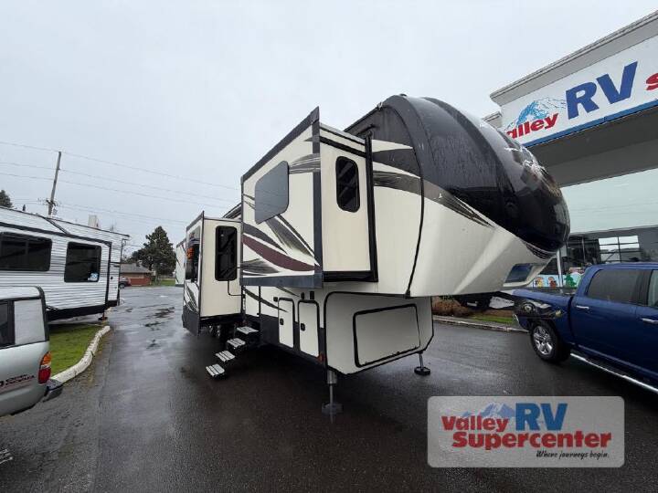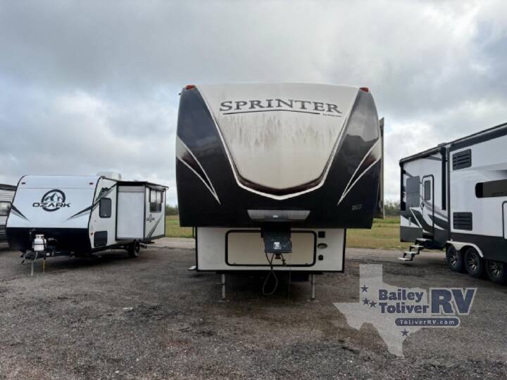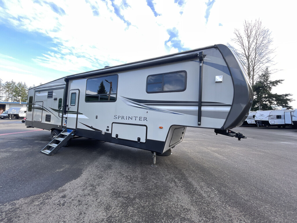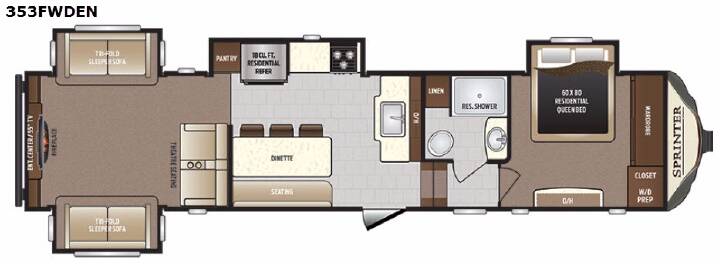 This Keystone Sprinter fifth wheel features a wide body design with quadruple slides which increases the size even more when all slides are fully extended. You are sure to love the den area with the rear entertainment center and fireplace.Enter model 353FWDEN and head up the steps on your right to the front master bedroom and side aisle bath. The bathroom offers a residential shower, toilet, sink, and linen cabinet. The private master bedroom at the end of the hall features a slide out residential queen size bed. There is also a dresser opposite, and full front wall wardrobe and closet prepped for a washer/dryer for all of your clothing storage needs.Heading towards the kitchen area you will find a dinette with booth seating along the curb side wall and three chairs on the opposite side. Along the interior wall find a kitchen sink with counter space on both sides plus overhead storage for your dishes and things. The kitchen continues to provide everything you need to prepare and cook food for your family including a slide out three burner range, an 18 cu. ft. residential refrigerator, and a pantry for your non-perishables.Continue towards the rear of this model to the den area to find theater seating for two facing the rear wall entertainment center which features a 55" TV, and a fireplace. There is more seating and sleeping space with the dual slide out tri-fold sleeper sofas on each side of the room, plus so much more.