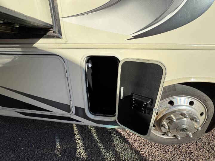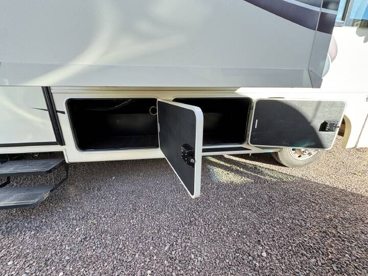 Self-contained amenities include toilet, medicine cabinet, CO detector, LP detector, and smoke detector for safety