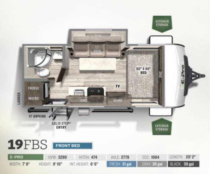 Measuring just over 20 feet in length and weighing approximately 3,300lbs dry, the E-Pro 19FBS is ideal for towing with many SUVs and half-ton trucks. Its lightweight design makes it easy to maneuver while still offering a spacious and functional interior.