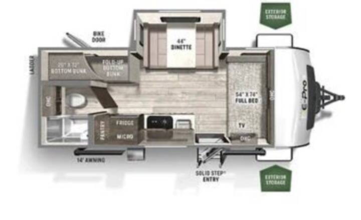Interior Comfort & Living Space The E20BHS floorplan centers on family-friendly living, with bunk beds for the kids or guests and a private Queen bed for parents. The design accommodates social meals and downtime with a functional kitchen and a lounge area enhanced by the slide-out. The unit provides essential amenities for comfort and convenience, including a dedicated TV for entertainment, a medicine cabinet, and a clean, compact shower and toilet arrangement that fits the compact footprint without sacrificing daily usability. Kitchen & Safety Features