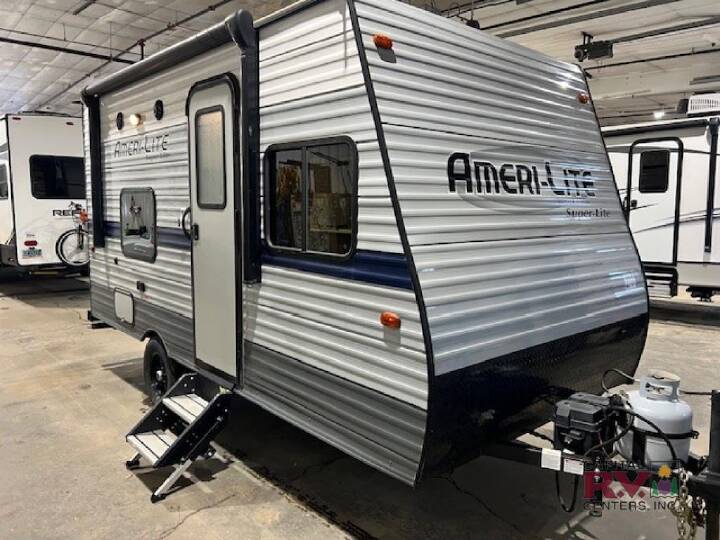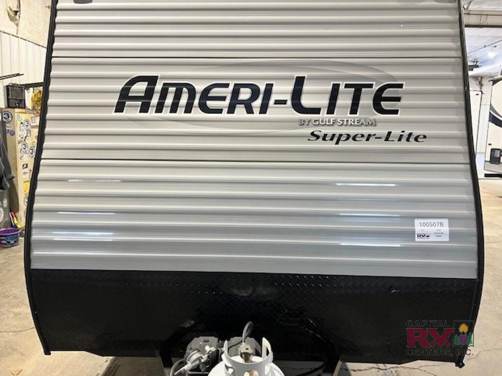 In this Ameri-Lite Super Lite travel trailer, you will not only find a trailer that is super easy to tow, but also filled to the brim with storage space. This model can sleep four people comfortably each night between the bunk beds and the convertible booth dinette, and the two-burner cooktop makes dinner preparations simple and affordable. You won't have to plan out your travel routes based upon accessible rest stops because the private bathroom included in this trailer gives you the ability to shower anywhere this trailer is parked. If you're looking for an affordable, lightweight travel trailer, you've found it in the Ameri-Lite Super Lite by Gulf Stream. These models may be lighter in weight, but they don't skimp out on comfortable features. Each unit includes high-performance vinyl flooring throughout, a white kitchen sink, craft-made cabinetry with designer pulls, plus fabric-wrapped box valances to make you feel right at home. The 16,000 BTU furnace and 13,500 BTU A/C will keep you comfortable in any season, and each model includes multiple USB ports for your tablet and phone and a 6' 8" ceiling height for added space. These models also include a 6-gallon gas DSI water heater, a central control panel to control your unit's functions, plus plenty of safety features you are sure to appreciate for your family. You can't go wrong with an Ameri-Lite Super Lite travel trailer. Choose your favorite floorplan today!