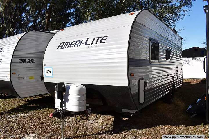 Perfect for weekend getaways or extended trips, this 2021 Ameri-Lite 189DD is a compact, easy-to-tow travel trailer with a single axle . Features include a power awning, front Murphy queen bed, rear bathroom, and a functional kitchen with dinette.
