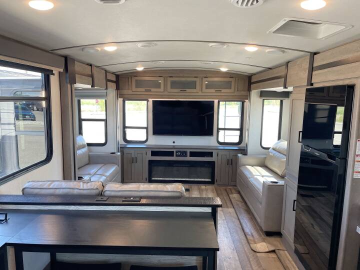 Also Includes: * REAR LIVING ROOM * THEATRE SEATING * HYDRONIC HEATING SYSTEM * 3 SLIDE OUTS * FIREPLACE * KING SIZE BED * HIDE-A-BED SOFA