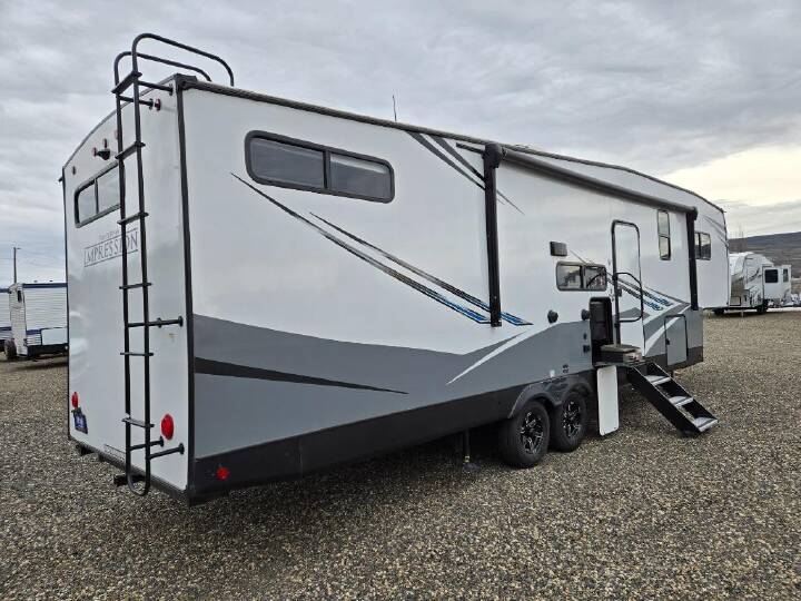 With any Impression mid-profile fifth wheel by Forest River, the focus of the design is comfort and value, built with quality craftsmanship and attention to customer's desires in each Impression! The exterior includes upgraded E-rated Goodyear Endurance tires made in the U.S.A., custom exterior graphics package, and One Touch automatic leveling system for easy setup. There is also an enclosed docking station and a gel coat fiberglass front cap with an automotive windshield with LED lights for style and beautiful views. The fully heated and enclosed AccessiBelly has removable underbelly panels and offers four seasons of travel.  The interior has oversized opening windows in the living area for more natural lighting and good air flow, a stainless steel single bowl sink with high rise faucet with a pulldown sprayer to easily clean the dishes, and a porcelain foot flush toilet to mention a few comforts and conveniences.