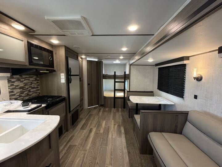 Also Includes: * FRONT QUEEN BED * GAS WATER HEATER * PATIO AWNING * POWER TONGUE JACK * FRONT & REAR STABILIZER JACKS * 1 SLIDE OUT * FRONT & REAR ENTRY DOORS * DUCTED AC * DOUBLE BUNKS * REAR CORNER BATH * DOUBLE DOOR REFRIGERATOR * BOOTH DINETTE * MICROWAVE * OVEN * 3 BURNER STOVE * JACKKNIFE SOFA