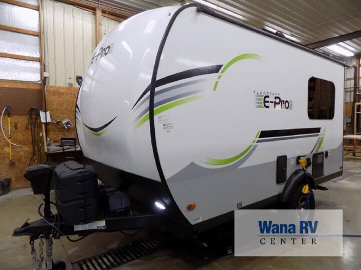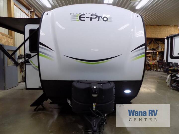 It's time to hit the road in this small, yet walkable travel trailer that is versatile to your needs and offers everything you will want to stay comfortable at a campground or off-grid. You can make meals using the cooktop and microwave up front and store your cold items in the 12V refrigerator. Take turns getting cleaned up in the wet bath so you can skip the public facilities, and store your clothing in the overhead cabinets. You can watch the 32"TV while dining or sleeping on the twin beds that offer a table top to help you convert this area into a king bed. And the 10' power awning will give you a place to hang out while you use the outdoor griddle. With any Flagstaff E-Pro travel trailer or toy hauler by Forest River, you will experience lightweight towing, style and features that will meet your needs, plus amenities that give you more than you expected! Built with interior and exterior Azdel construction, tongue and grove plywood flooring, and a vacuum laminated roof and walls, plus torsion axle, Rubber-Ryde suspension, and a tire pressure monitoring system for safety while traveling. And the 190-watt roof mount solar panel with 1,000-watt inverter will allow you to stay off-grid if you like. The interior offers a comfortable environment with the choice to use the air conditioner or furnace, and an AM/FM stereo with Bluetooth and USB will allow you to listen to your favorite tunes and keep your cell phone charged. Make your selection today!