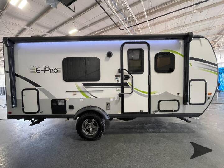 Whether you enjoy staying at the campground for a weekend or longer and/or you enjoy off-grid camping, this 20'2" long trailer gives you lots of interior space and versatility to enjoy each and every trip. From the Murphy bed/sofa combo up front offering sleeping space and seating depending on which you prefer at the time, to the full rear bathroom which also offers linen storage, you will have everything you need. And the kitchen cooktop, microwave and 12V refrigerator allow you to make meals and store leftovers. Two can dine at the booth dinette or you can eat outdoors under the 14' power awning. With any Flagstaff E-Pro travel trailer or toy hauler by Forest River, you will experience lightweight towing, style and features that will meet your needs, plus amenities that give you more than you expected! Built with interior and exterior Azdel construction, tongue and grove plywood flooring, and a vacuum laminated roof and walls, plus torsion axle, Rubber-Ryde suspension, and a tire pressure monitoring system for safety while traveling. And the 190-watt roof mount solar panel with 1,000-watt inverter will allow you to stay off-grid if you like. The interior offers a comfortable environment with the choice to use the air conditioner or furnace, and an AM/FM stereo with Bluetooth and USB will allow you to listen to your favorite tunes and keep your cell phone charged. Make your selection today!