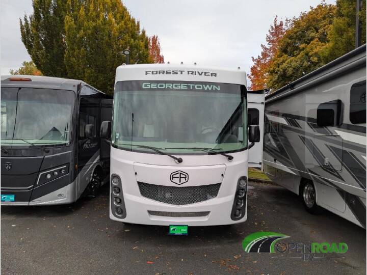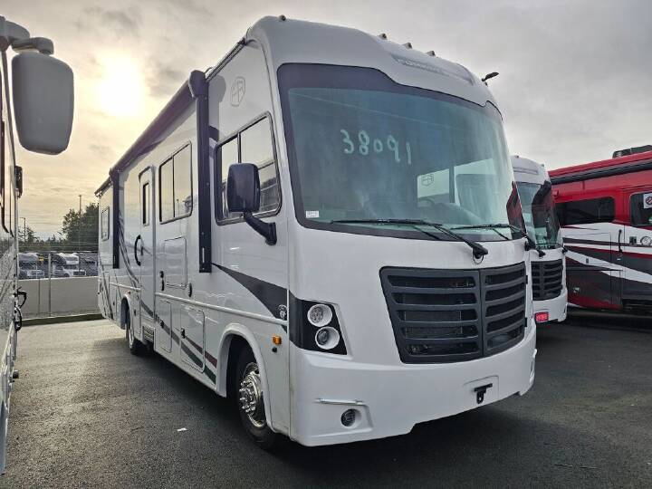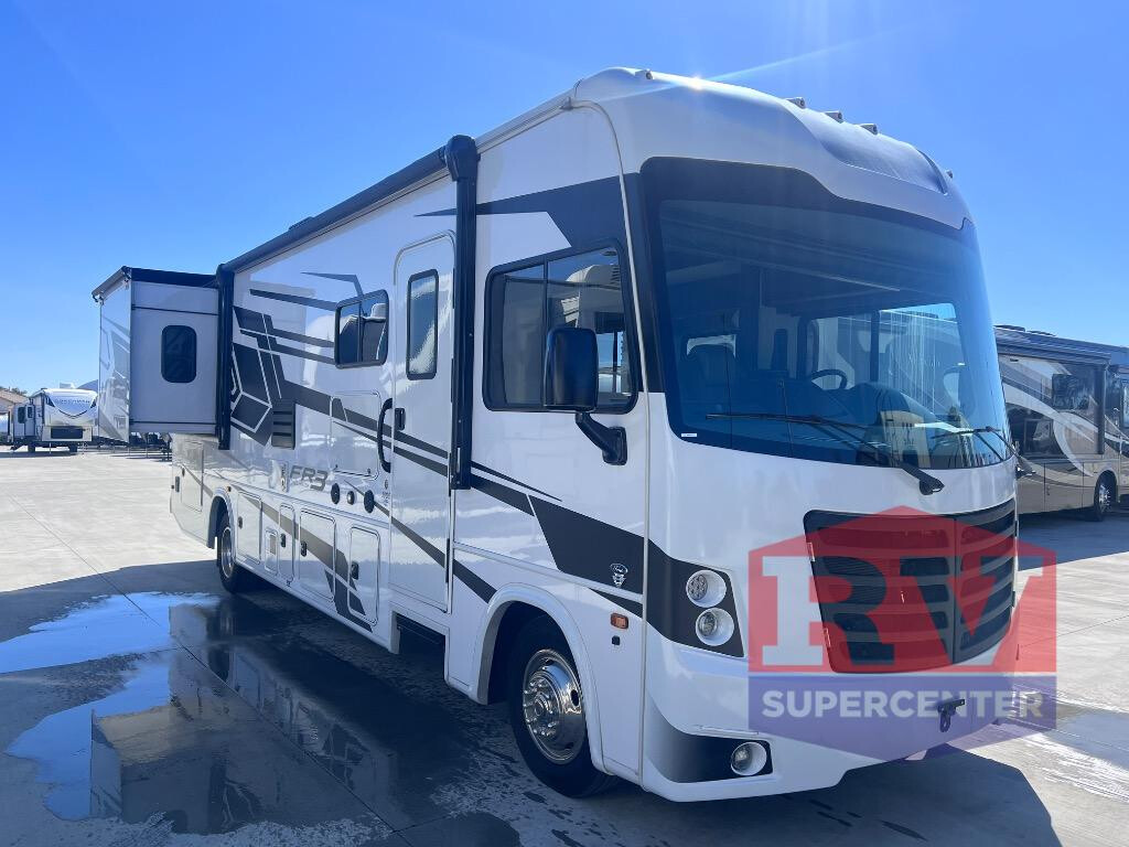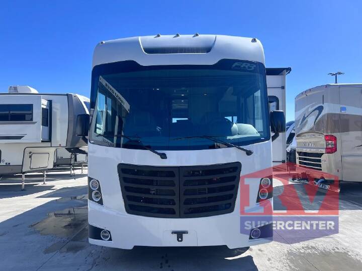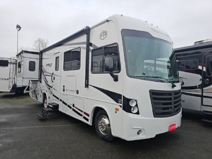 Whether you travel with your spouse, grandkids or friends, this FR3 Class A gas motorhome allows you to travel in style with plenty of additional sleeping choices from the power overhead bunk to the furniture once they are set up at night. You can dine at the wrap-around booth dinette, relax on the hide-a-bed sofa, and make full meals in the kitchen which also includes a residential microwave and countertop extension. The separated bathroom allows someone to take a shower while another freshens up with the private sink and toilet, or maybe you decide to close this area off within the bedroom. Every night you can sleep like a king while watching the 32" LED 12V TVin the bedroom, and maybe you decided to add the washer/dryer option to keep everything clean while on the road. With each FR3 Class A gas motorhome by Forest River, you will find an easy-to-drive coach with a spacious interior allowing you to gather with friends and family with convenience and style found throughout! Each is built with vacuum-bonded construction, a one-piece fiberglass roof with extended rain spouts, a steel firewall and A-pillar extension, Bi-LED headlamps and lower LED fog lights, and grey Rotocast storage boxes with drains. Inside, you will enjoy black hardware, appliances, plumbing fixtures, and a glass shower door frame. You will also find a stainless steel kitchen sink with a bamboo cutting board and roll-up dryer, heavy-duty full-extension ball bearing drawer guides, dual-access dinette storage with doors, and nightstands with charging stations to keep your cellphones ready for whatever is next. Make your selection today!