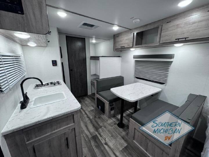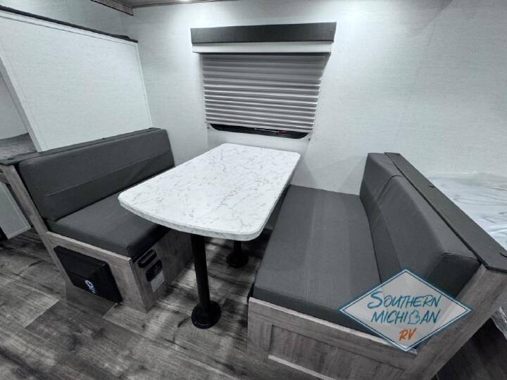 It's easier than ever to enjoy the camping lifestyle with this lightweight travel trailer. There are bunk beds for your guests or little ones, a front bed for you, plus a booth dinette that can double as dining and sleeping space. The private toilet and shower will allow you to stay clean throughout each trip, and since the sink is at the kitchen counter, someone can brush their teeth while the other showers before bed. You will love the fireplace included in this model for a more at-home feel, or you just might find yourselves outdoors under the power awning most of the day! If you're looking for an affordable, lightweight travel trailer, you've found it in the Ameri-Lite Super Lite by Gulf Stream. These models may be lighter in weight, but they don't skimp out on comfortable features. Each unit includes high-performance vinyl flooring throughout, a white kitchen sink, craft-made cabinetry with designer pulls, plus fabric-wrapped box valances to make you feel right at home. You'll enjoy the 6' 8" interior height, wood ceiling trim, multiple USB ports, and more features included within the Camping Package. These models also include a tankless water heater, a central control panel to control your unit's functions, plus plenty of safety features you are sure to appreciate for your family. You can't go wrong with an Ameri-Lite Super Lite travel trailer. Choose your favorite floorplan today! 2 burner cook top, spare tire w/carrier, electric awning, teddy bear mattresss (bunks) high rise kitchen faucet, central control panel, radial tires, fire place