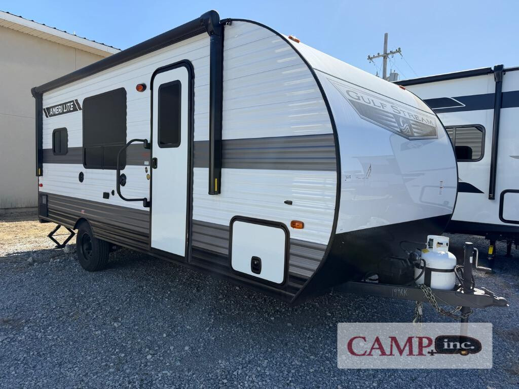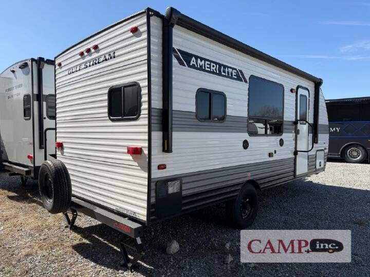 2024 Gulf Stream RV Ameri-Lite Super Lite 199RK, Gulf Stream RV Ameri-Lite Super Lite travel trailer 199RK highlights: Sofa Overhead Cabinets Large Pantry Queen Bed 10 Cu. Ft. 12V Refrigerator Pots and Pans Drawer When you take a trip in this Ameri-Lite Super Lite travel trailer, you take a trip in affordable style. The booth dinette is the perfect place to gather together for a breakfast feast, but it also helps this trailer sleep four people comfortably each evening because it folds into a bed whenever needed. The queen-size bed in the front of this trailer adds an extra bit of sleeping space, and the overhead cabinets that are scattered throughout give this trailer many places to store all of your traveling necessities. The rear corner bath is convenient to access and provides extra privacy. If you're looking for an affordable, lightweight travel trailer, you've found it in the Ameri-Lite Super Lite by Gulf Stream. These models may be lighter in weight, but they don't skimp out on comfortable features. Each unit includes high-performance vinyl flooring throughout, a white kitchen sink, craft-made cabinetry with designer pulls, plus fabric-wrapped box valances to make you feel right at home. You'll enjoy the 6' 8" interior height, wood ceiling trim, multiple USB ports, and more features included within the Camping Package. These models also include a central control panel to control your unit's functions, plus plenty of safety features you are sure to appreciate for your family. You can't go wrong with an Ameri-Lite Super Lite travel trailer. Choose your favorite floorplan today.